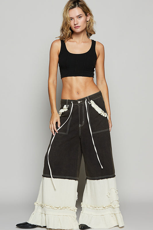 Applause Please Patchwork Tiered Ruffle Exaggerated Wide Leg Jeans