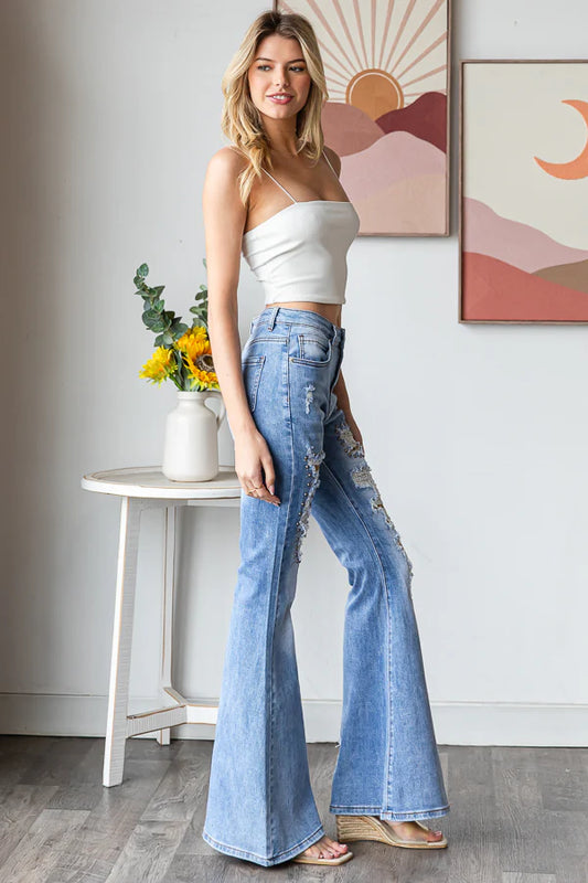 Eye Candy Washed Floral Patched + Embroidered Flares