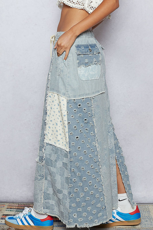 Maxed Out Corded Waist Patchwork Denim Skirt