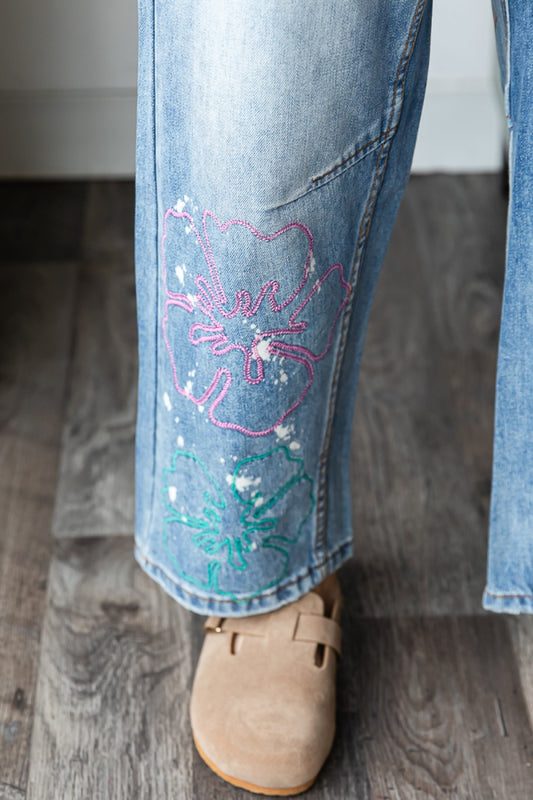 Flower Power Embroidered Straight Wide Leg Jeans