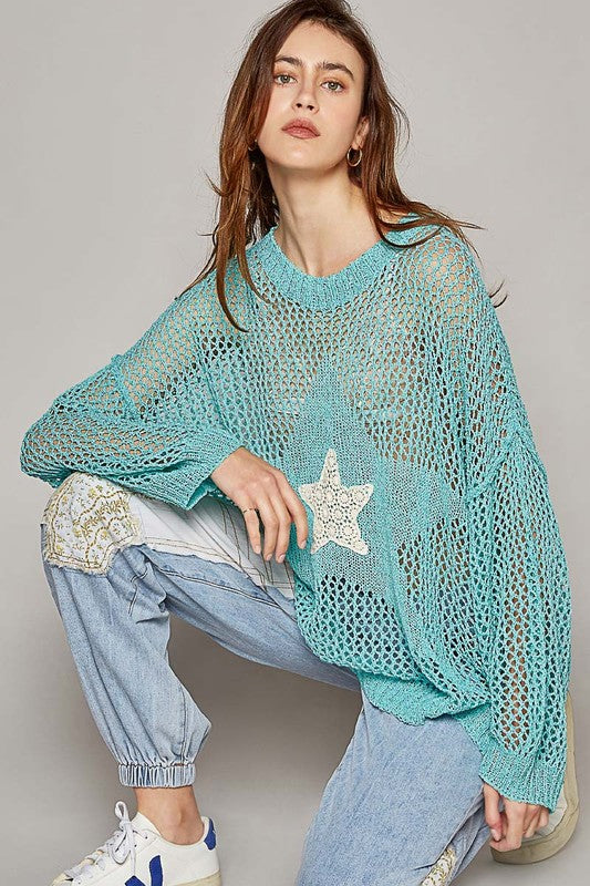 Written In The Stars Open Weave Star Patch Thin Slouchy Sweater