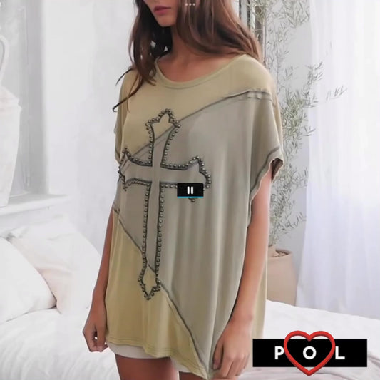 Embellished Faith Embroidered and Studded Two Tone Short Sleeve Top