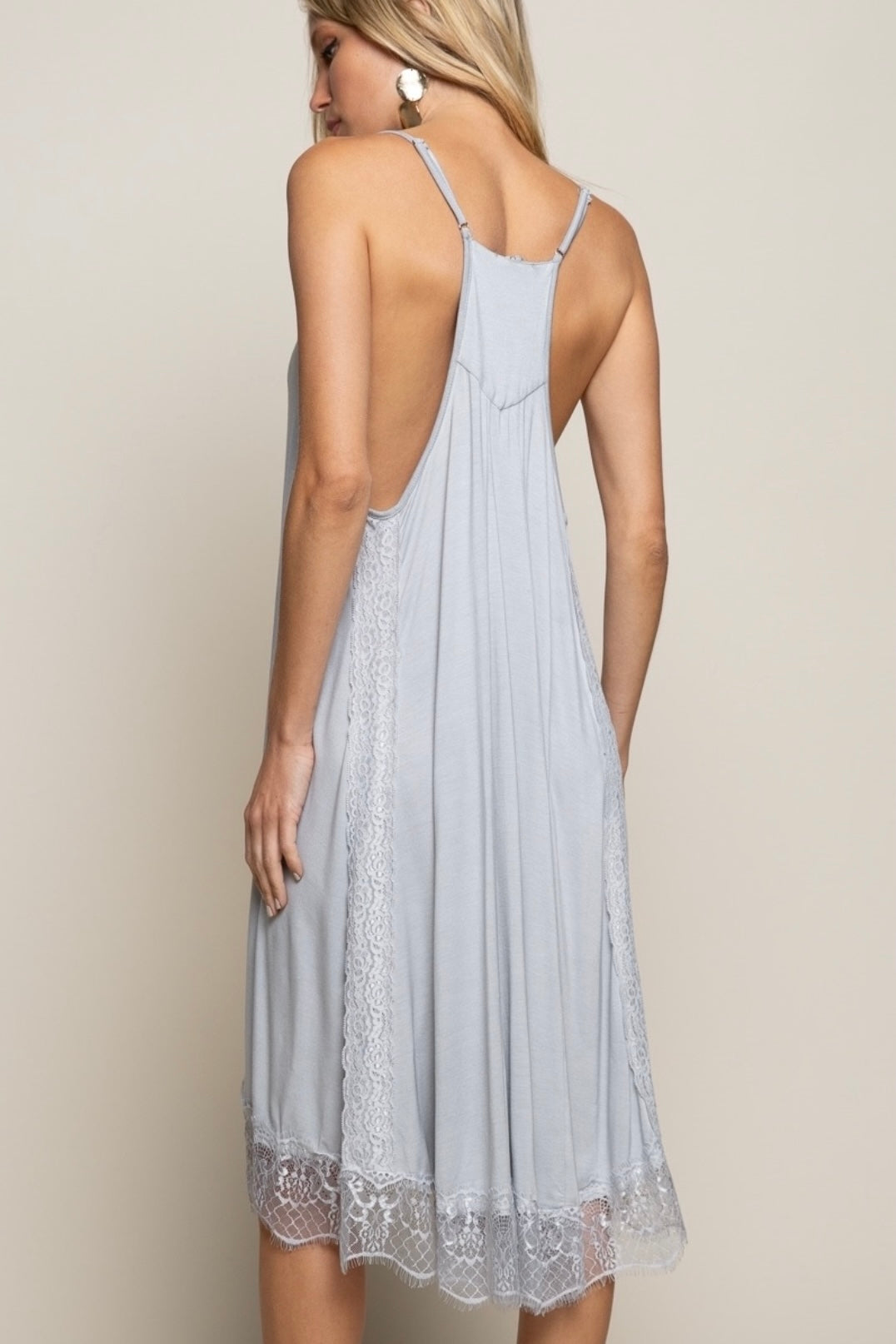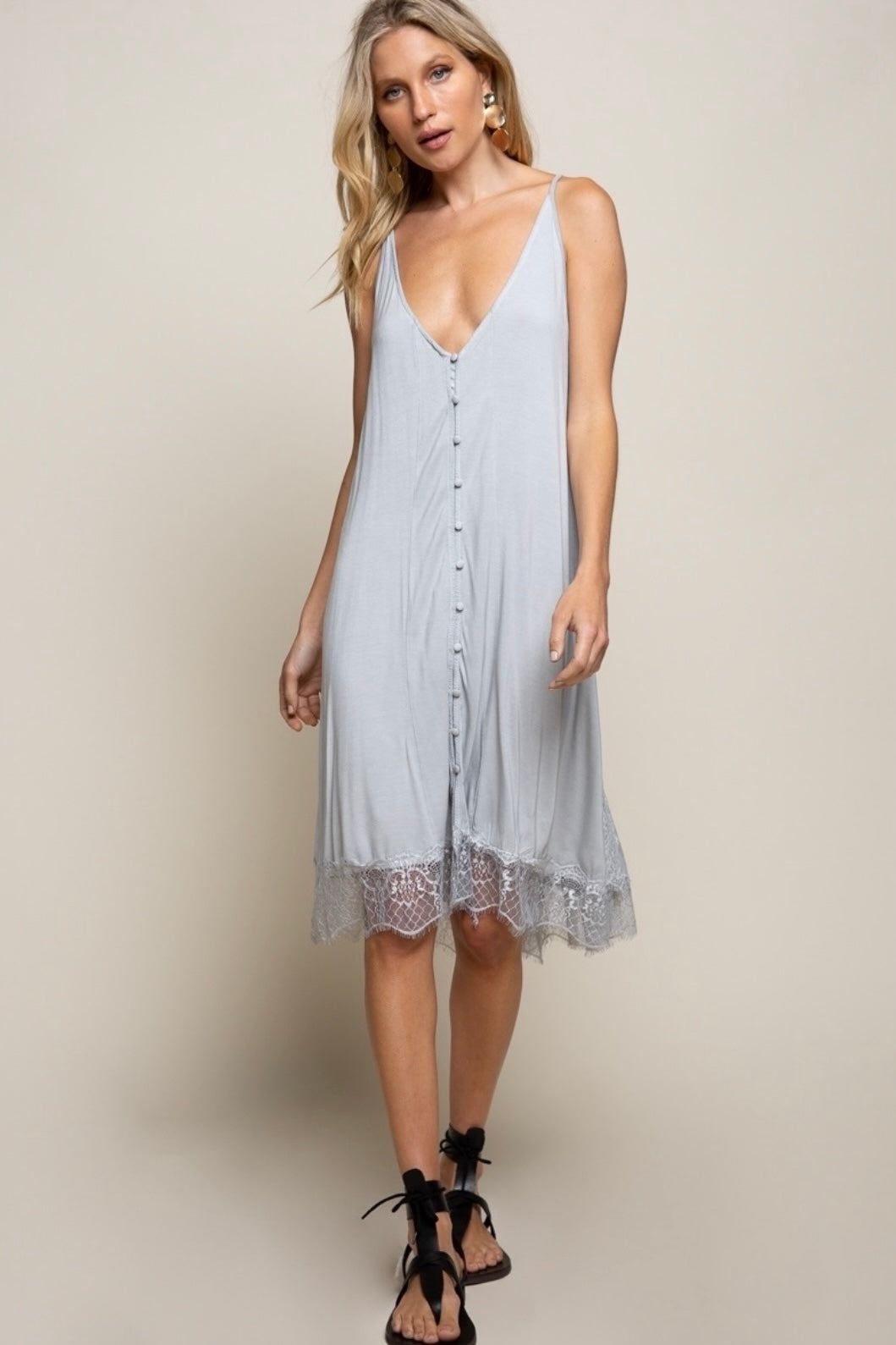 This isn’t your average slip dress—it’s your after-dark alter ego. Made from luxe rayon jersey that drapes like a whispered secret, this midi hugs in all the right places and floats everywhere else. The plunging V neckline and dropped armholes serve drama, while the racerback and adjustable straps keep it wearable. Button front closure adds just enough tease, and that scalloped lace hem? It’s giving “I didn’t come here to behave.”