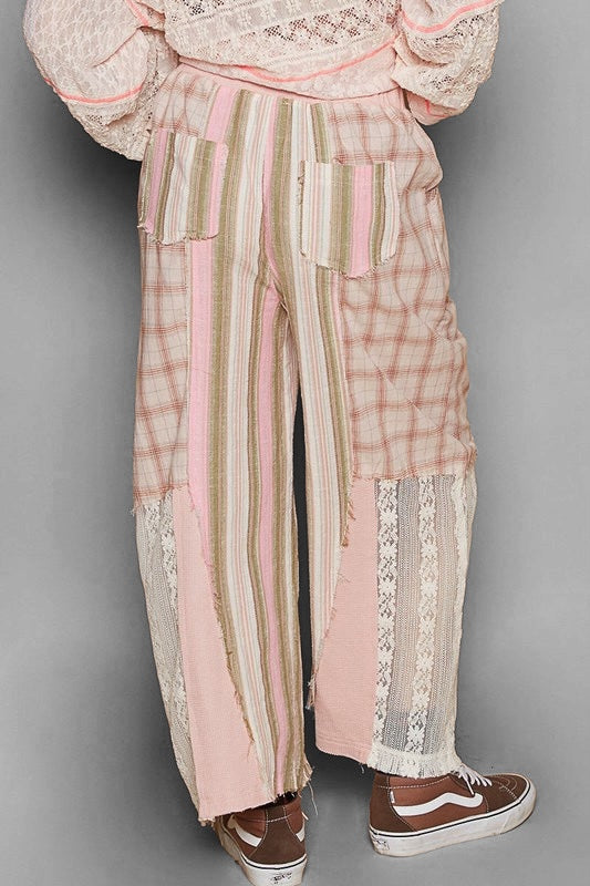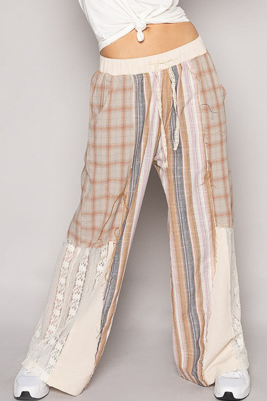 August Moon Striped Plaid Lace Detail Cotton Pants (3 Colors)