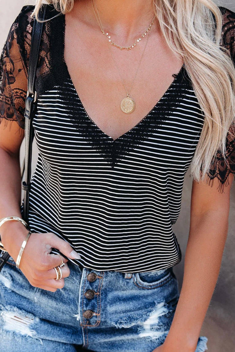Be My Baby Striped V Neck Lace Sleeve Rayon Jersey Tee (2 Colors)