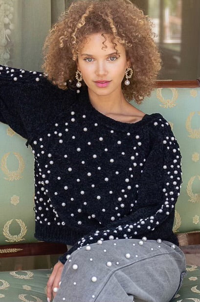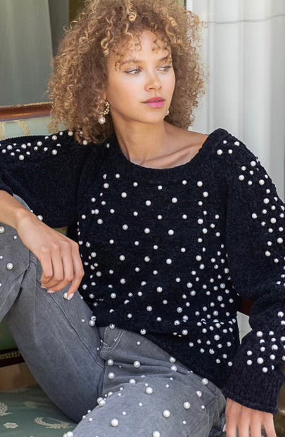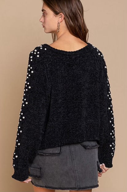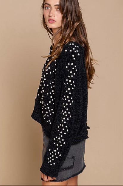 Black Magic Pearl Beaded Velvet Chenille Sweater