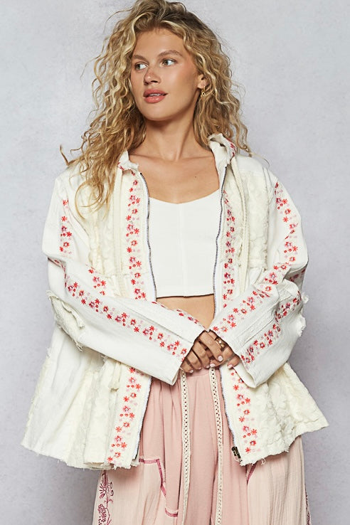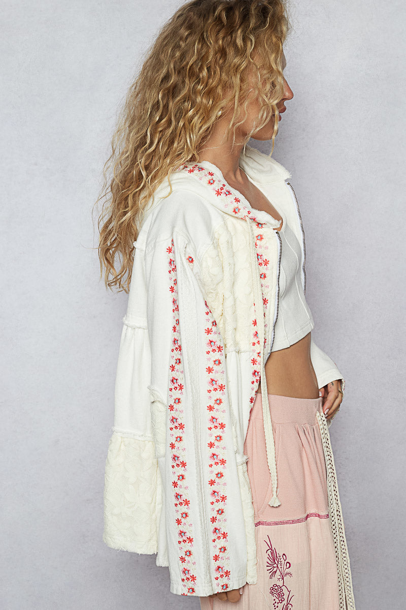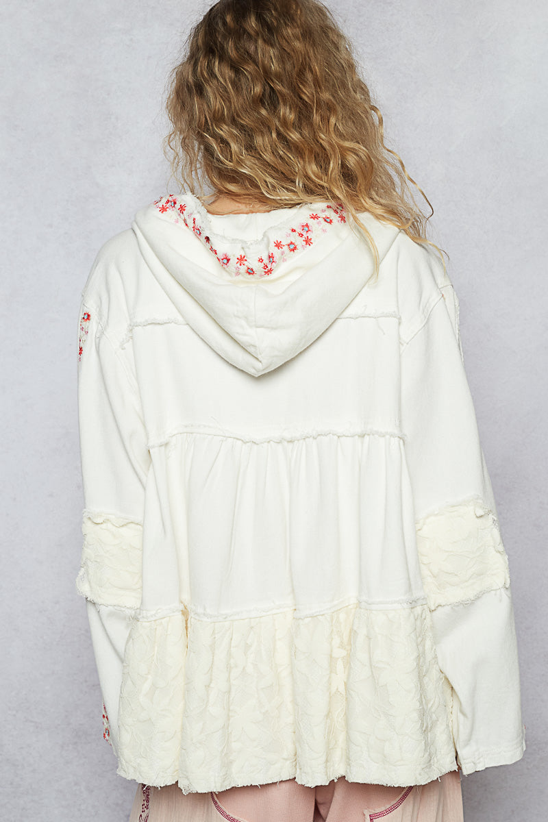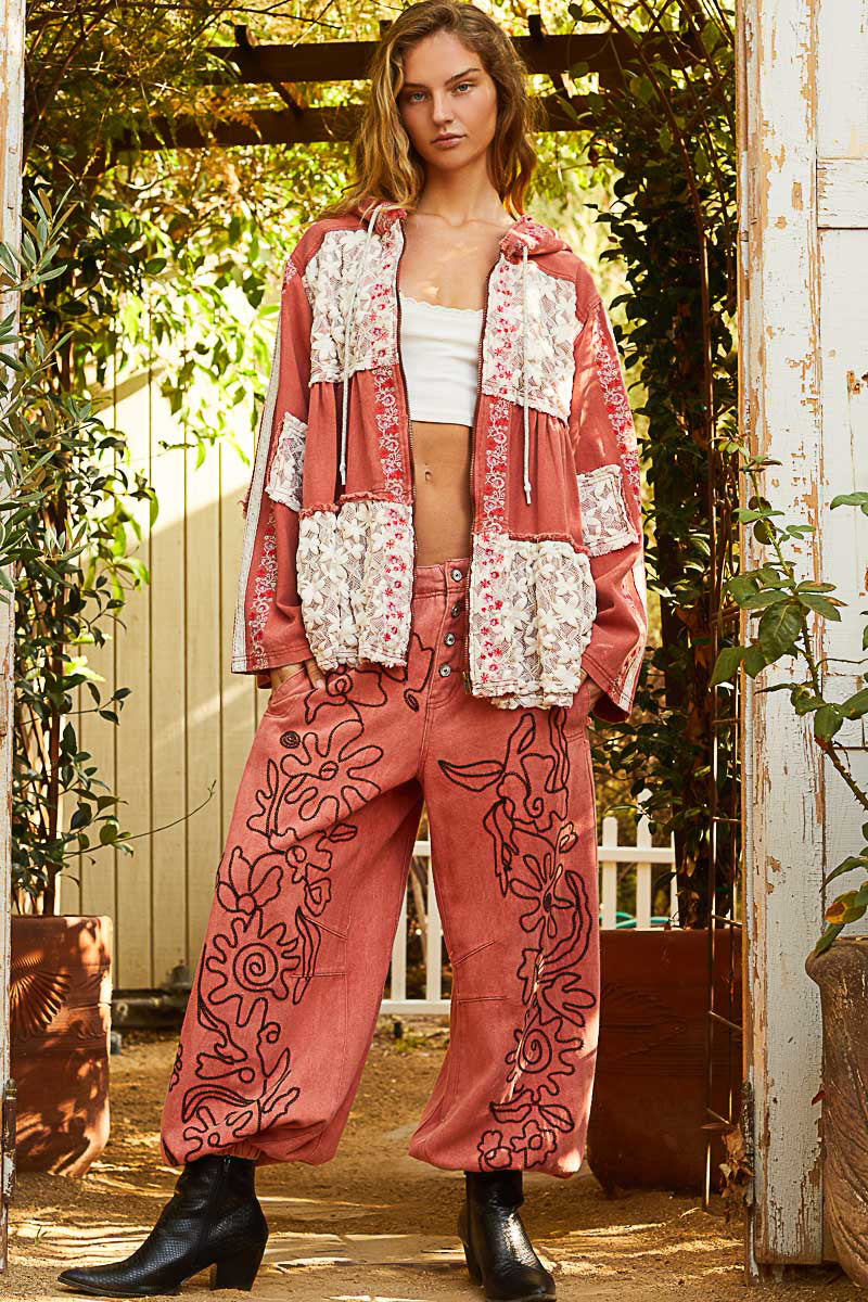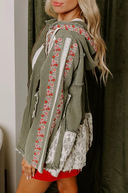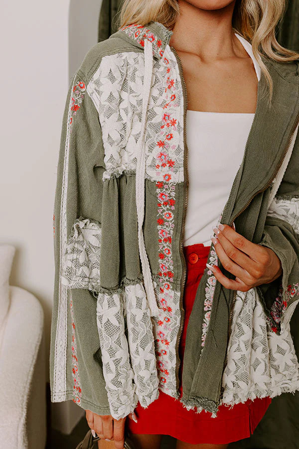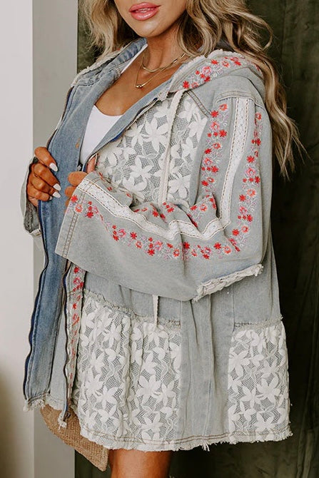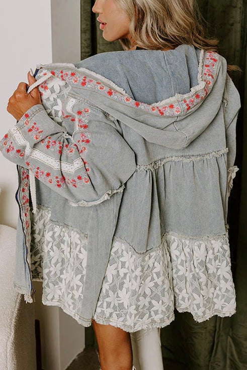 This embroidered denim hoodie blends structured denim with soft lace in a tiered silhouette that moves like she’s got somewhere better to be. Styled as a patchwork jacket meets lace hoodie, this embroidered denim hoodie layers easy, wears bold, and keeps the compliments coming. The floral embroidery hits like a mood, the hood adds off-duty edge, and the zip front makes her easy to throw on and hard to ignore. Long sleeves, relaxed fit, and four colorways mean she’s styled for layering, built for compliments, and ready to headline your transitional fits.