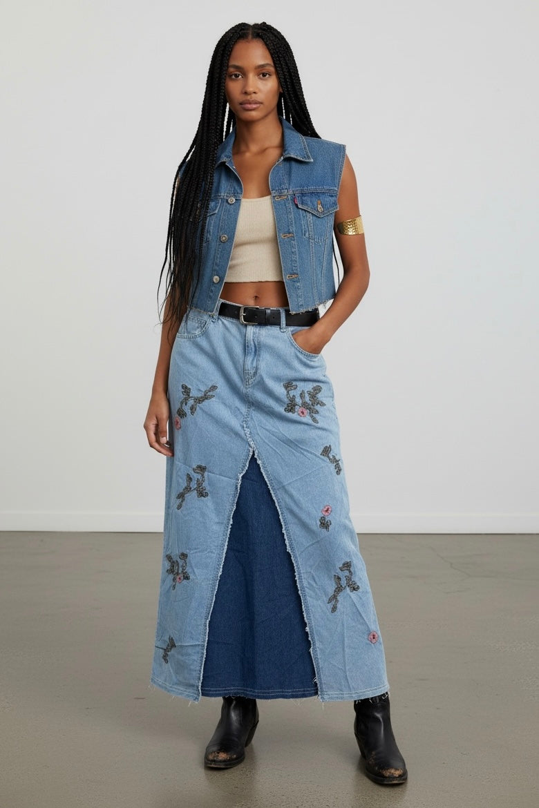 Catch The Sun Embroidered Mixed Denim Maxi Skirt