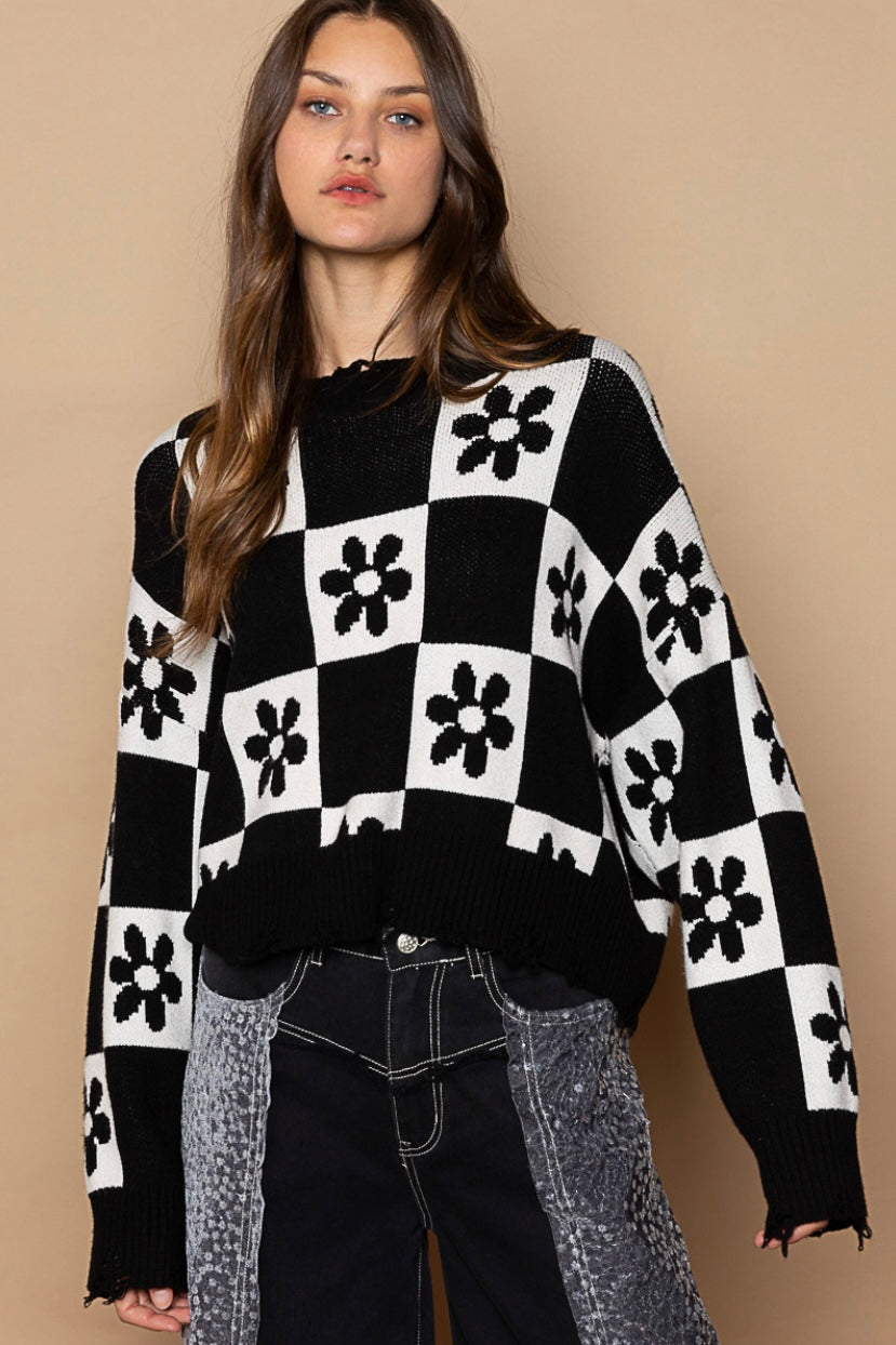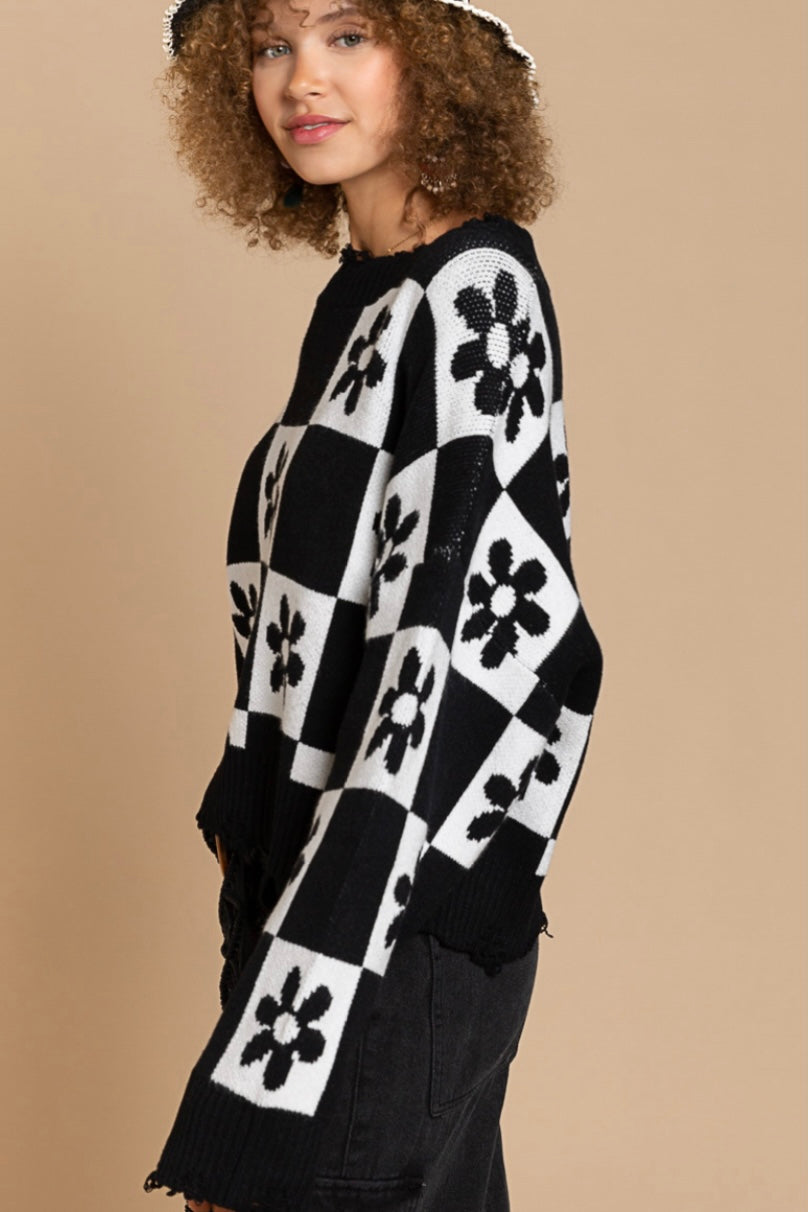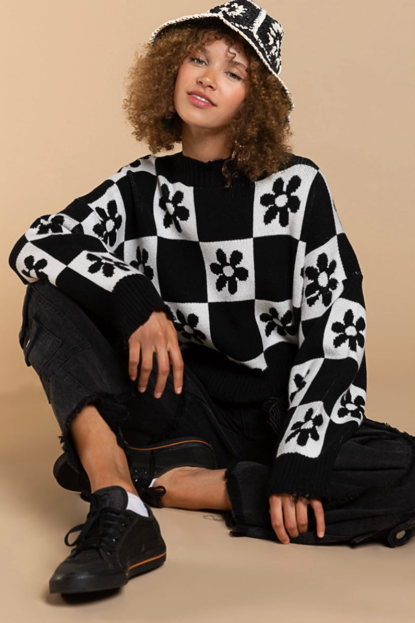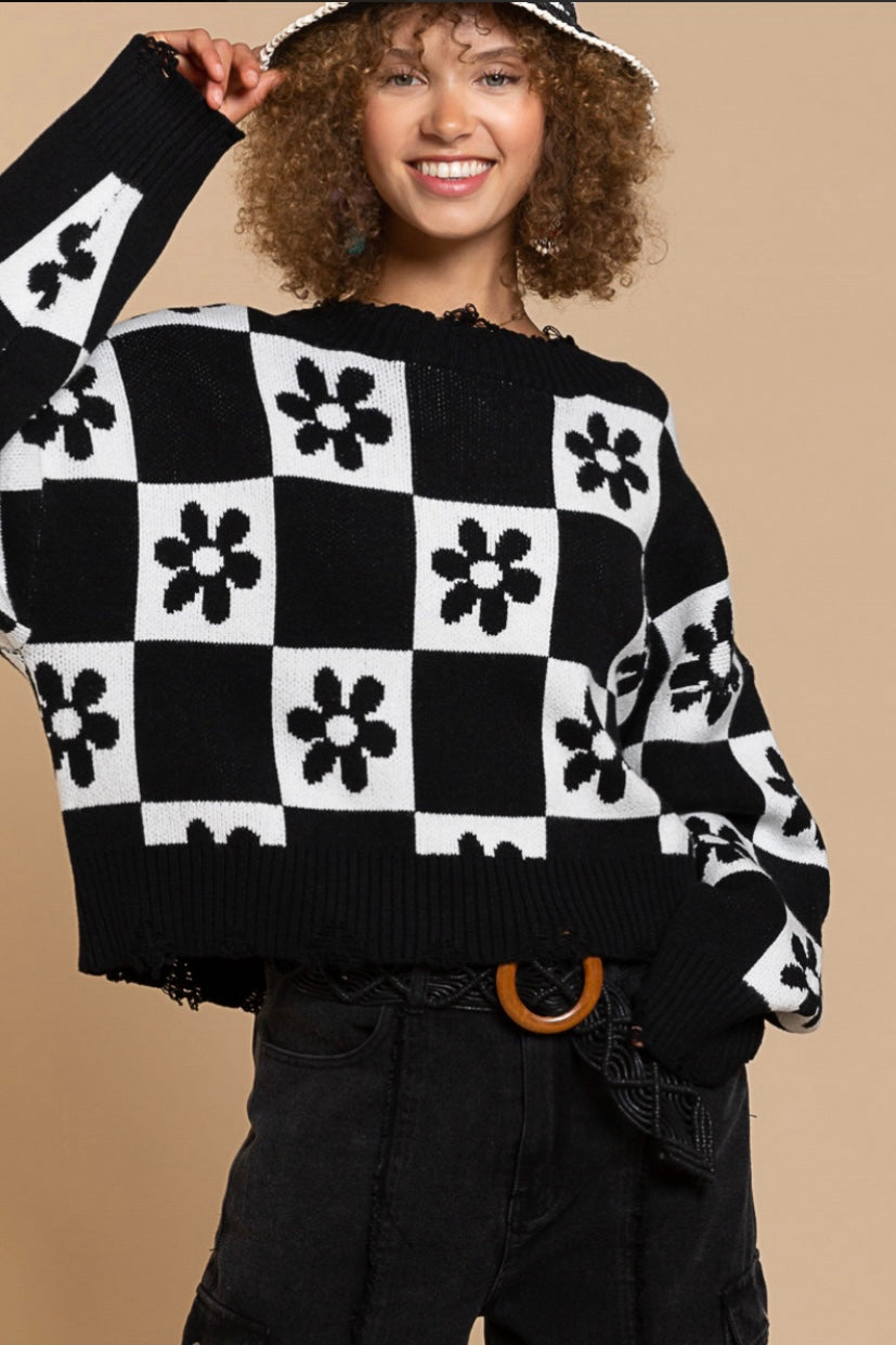 The Box of Daisies Sweater blends checkerboard nostalgia with statement florals for a vibe that’s half vintage, half trendsetter. The relaxed drop-shoulder fit and cropped distressed hem keep it effortlessly modern while the black-and-white palette gives instant outfit authority — just add denim or cargos and watch the compliments stack