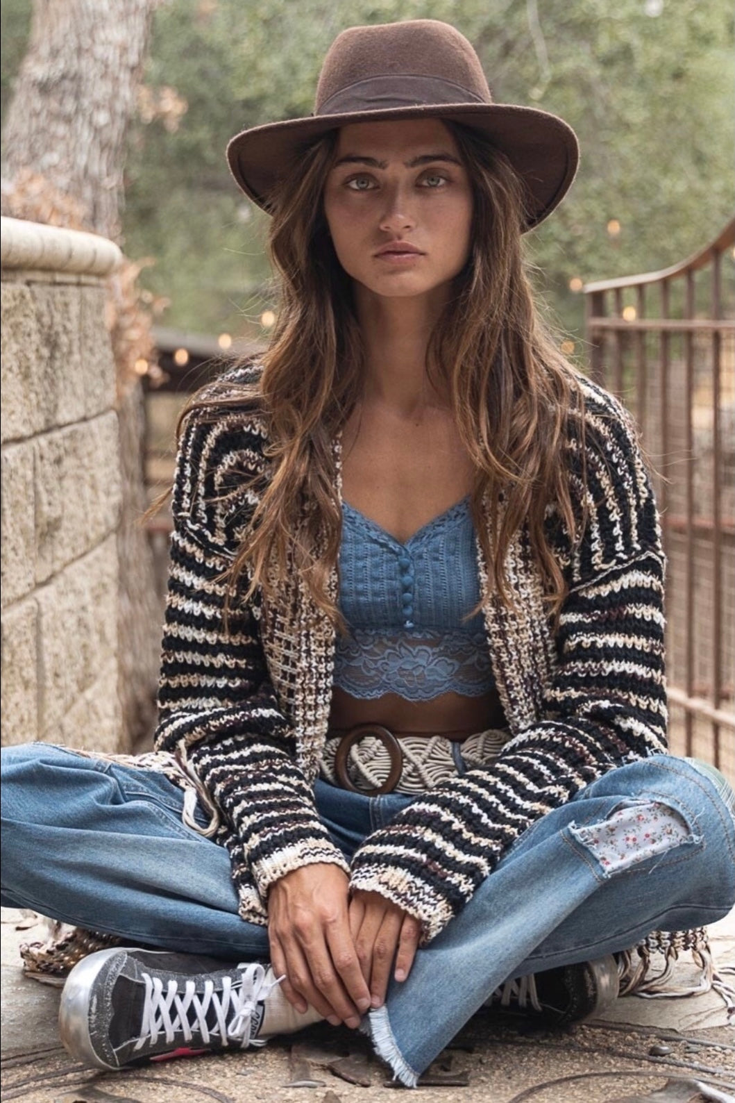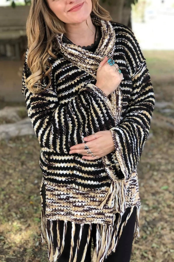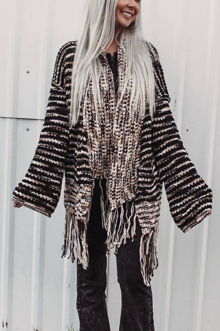 The Wintered Woods Striped Tassel Fringe Cardigan wraps you in bold mocha-cream-espresso stripes, fringe drama, and that effortlessly undone energy you only get from a perfectly oversized fit. With a shawl collar, front pockets, and soft knit texture, she’s the one you grab when you want casual to look intentional.