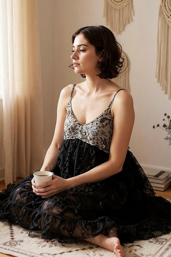 Designed to charm on sight, this floral lace babydoll pairs a smocked bust with soft ruffled lace and a wide V neckline that frames just right. The babydoll silhouette is flirty and forgiving, while adjustable straps let you dial the drama from garden party to midnight mischief. Finished with a flounce hem that moves like magic. Available in three colorways—each with its own vibe and endless styling power.