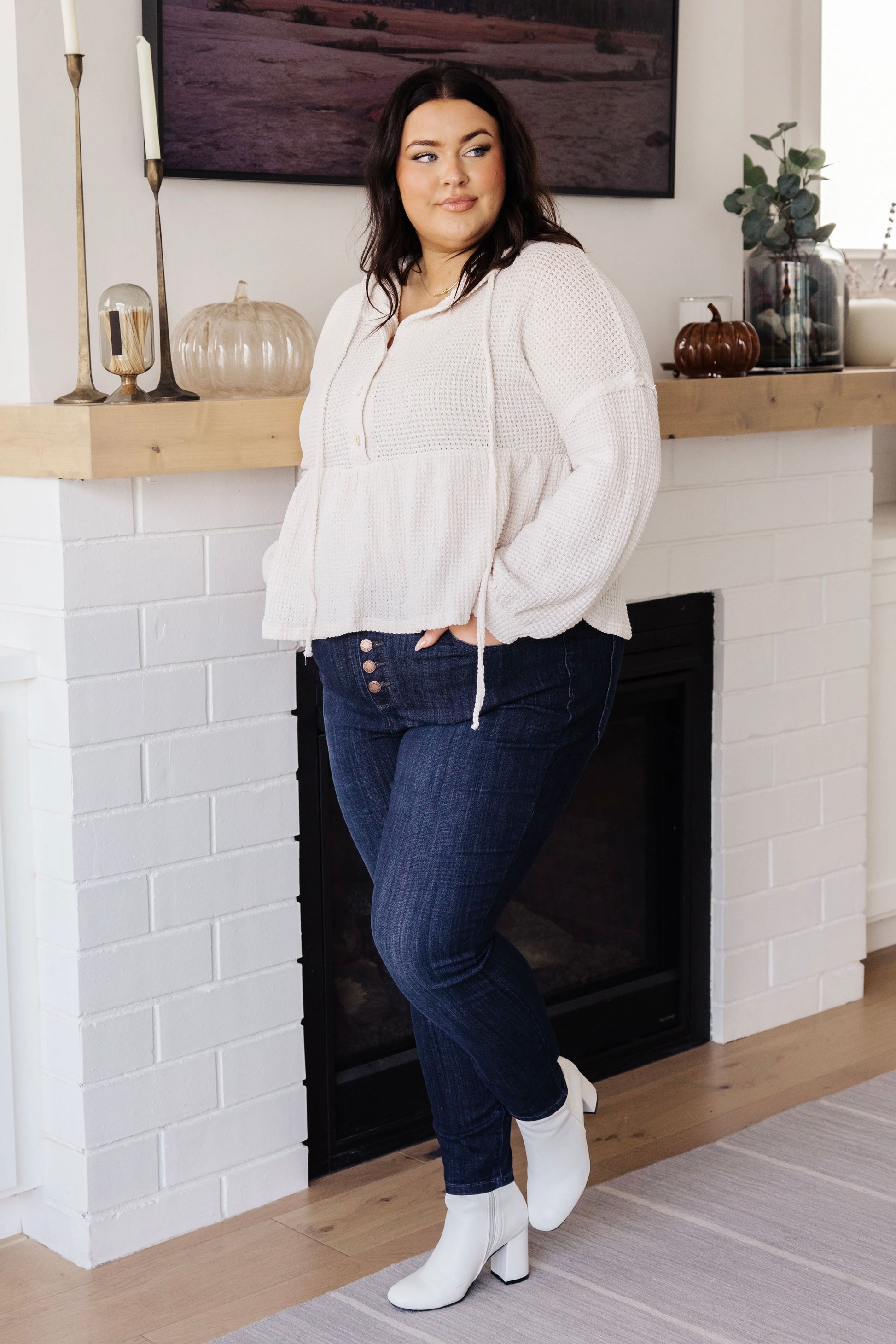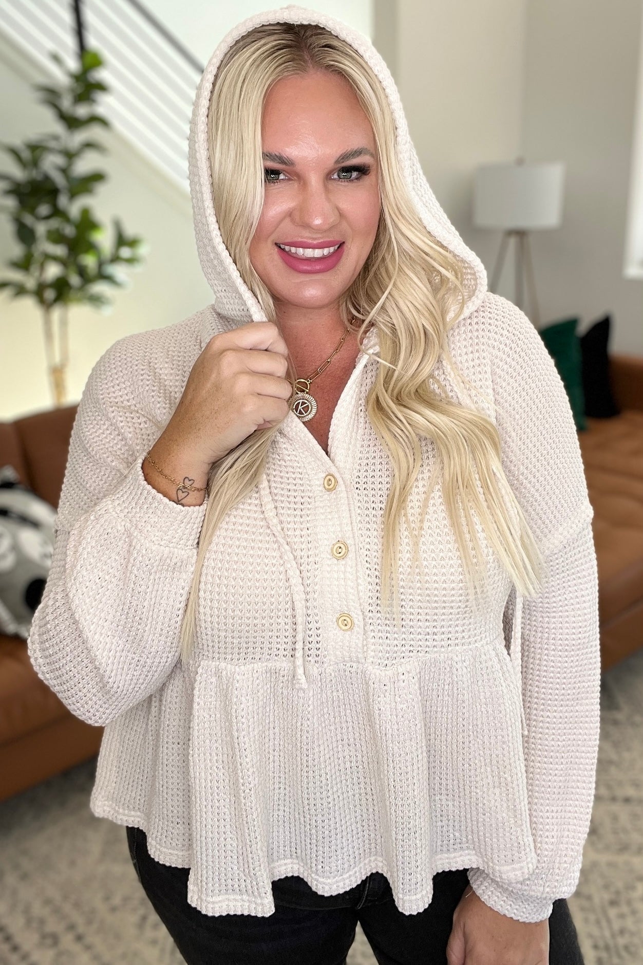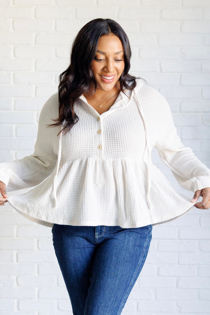 Get cozy in style with our One And Only Thermal Knit Babydoll Hoodie! This lightweight and super-soft henley has a half button up closure, a drawstring hood, and a cute babydoll peplum silhouette, making it the perfect combo of comfort and cuteness.