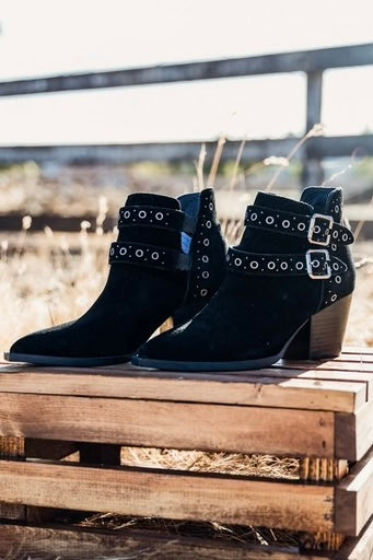 Feature stylish hardware with brass grommets and adjustable buckles, these genuine suede ankle boots are the hit of the season!