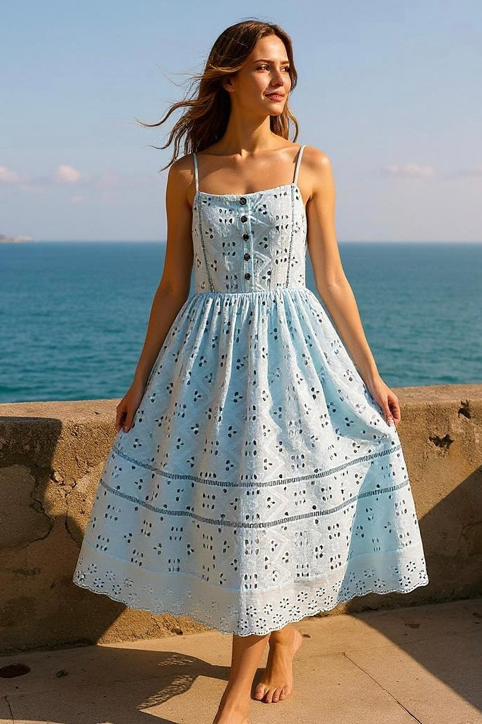 Bask in la dolce vita with this sky blue cotton eyelet sundress, your effortless ticket to a Mediterranean summer wardrobe. Designed with a breezy midi silhouette, lightweight cotton fabric, and dainty decorative buttons down the front, this coastal-chic stunner brings elegance and ease to every seaside escape. Whether you’re strolling the streets of Capri or lounging by a lemon grove in Sorrento, it’s the ultimate vacation dress for channeling that trending Euro summer style.