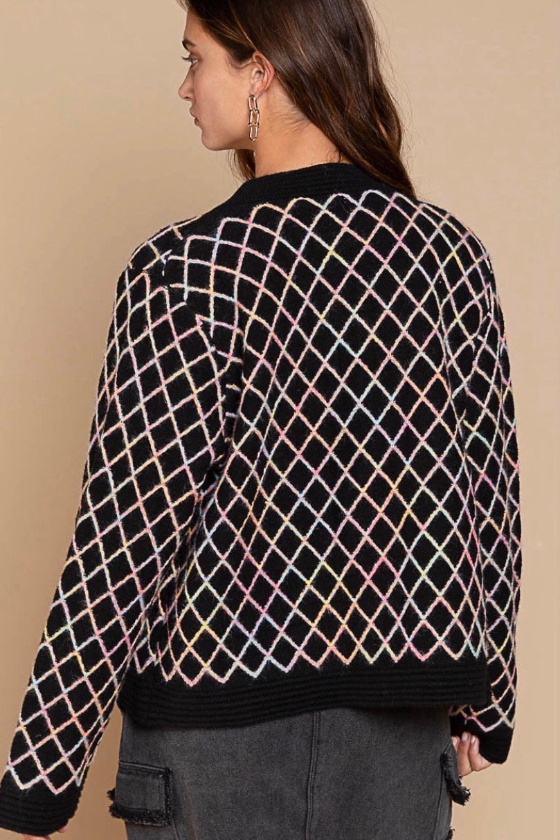 Black knit cardigan with a multicolor diamond pattern, opulent MOP buttons, and a relaxed silhouette for bold, cozy layering.