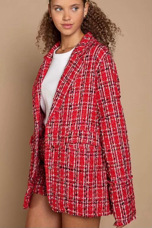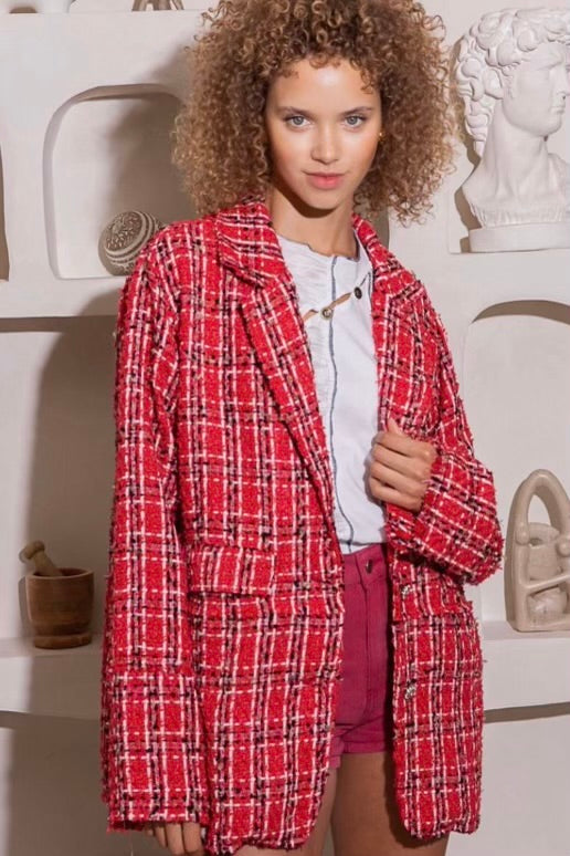 Add some heat to your wardrobe with the Hearts on Fire Red Tweed Blazer! This fiery piece will set you apart from the crowd with its sophisticated + timeless design. It adds a luxe pop of color to any outfit. It’s also roomy enough to layer so it can be worn most of the year. Dare to be different and ignite your style with this bold blazer. Caution: May cause outfit envy.