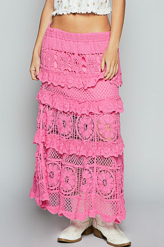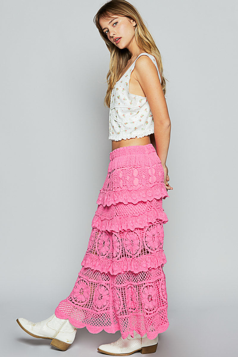 Kava Nights Tiered Ruffled Flowy Crochet Maxi Skirt