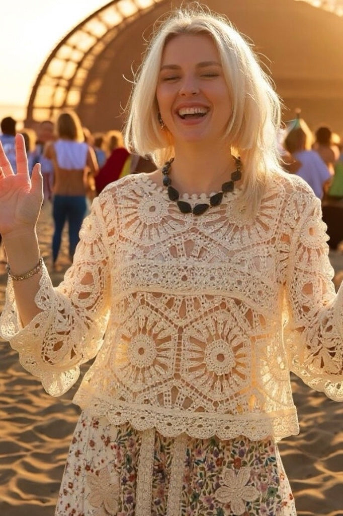 Layer Cake isn’t just a top—it’s a moment. Designed in a cropped silhouette with 3/4 flare sleeves and a round neckline, this sheer crochet stunner is crafted from open-weave patterns that whisper sweet rebellion. Available in black and cream, she layers like a dream and stuns on her own.