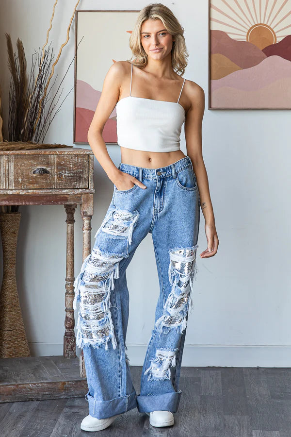 Lit Up Silver Sequin Patched Distressed Baggy Jeans