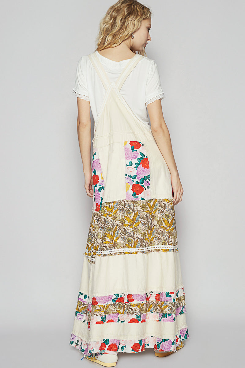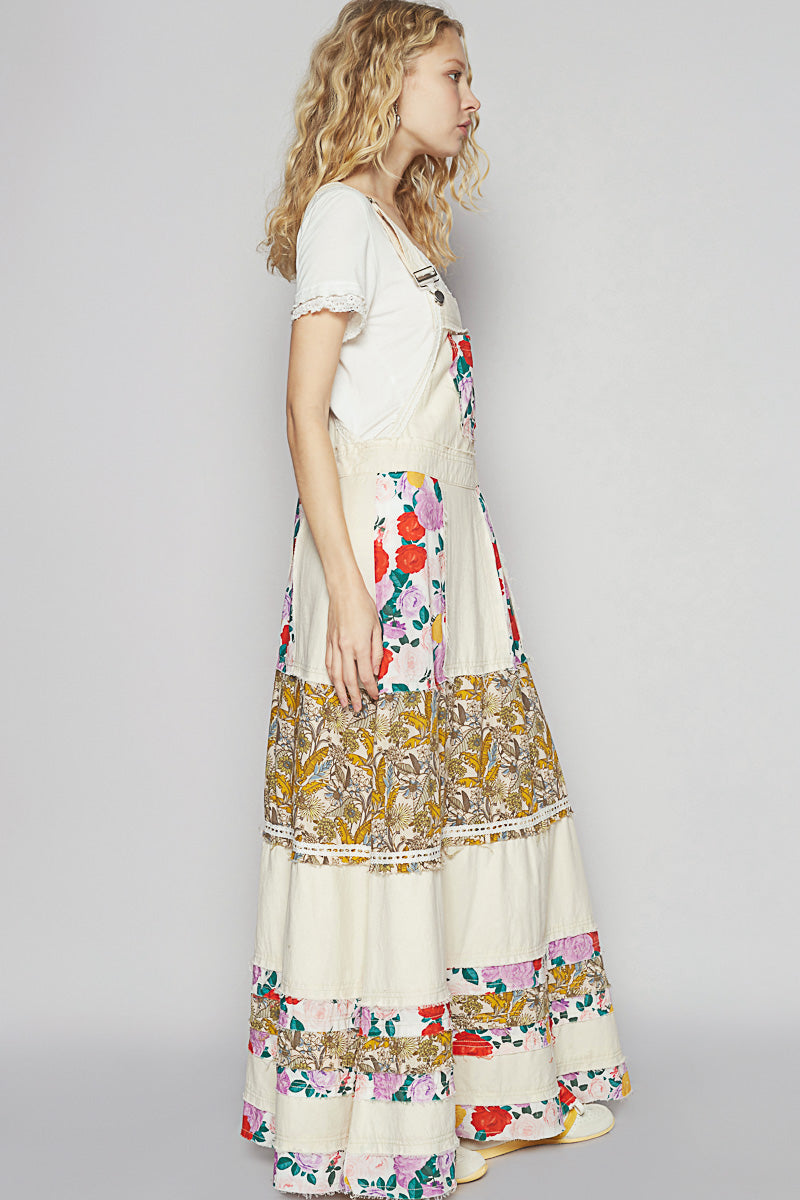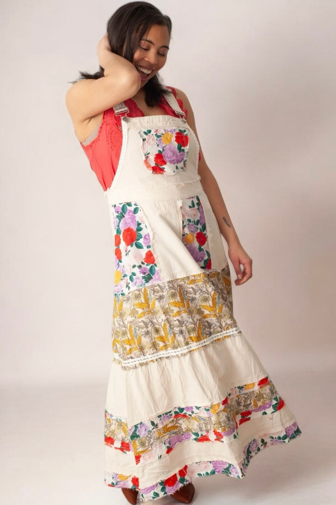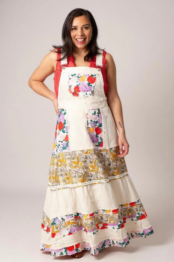 This denim skirtall is a full-length statement—washed ivory cotton twill meets bold floral patchwork and lace trim in a silhouette that’s prairie with punch. The relaxed fit keeps it easy, the adjustable straps let you style it your way, and the raw outseams add just enough edge to say “I’m sweet, but don’t test me.” Front bib pocket? Functional. Maxi length? Dramatic. Every detail is a little romantic, a little rebellious, and totally unforgettable.