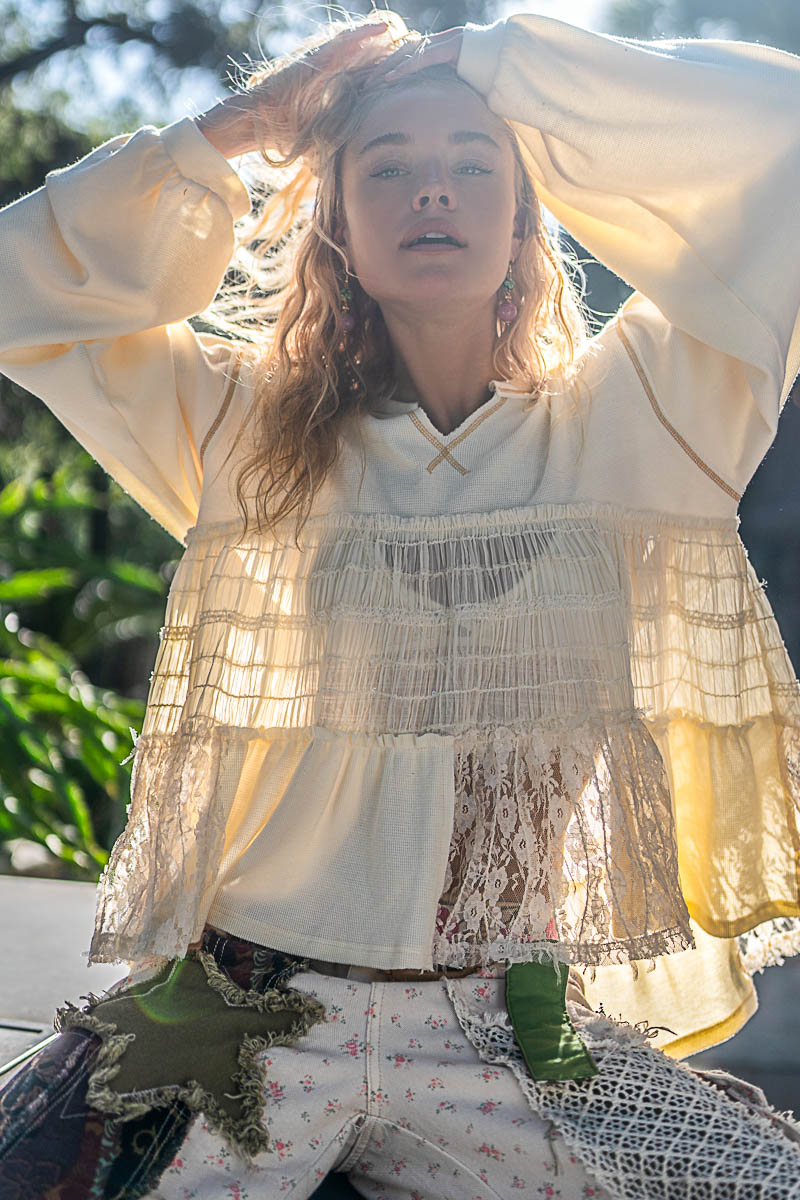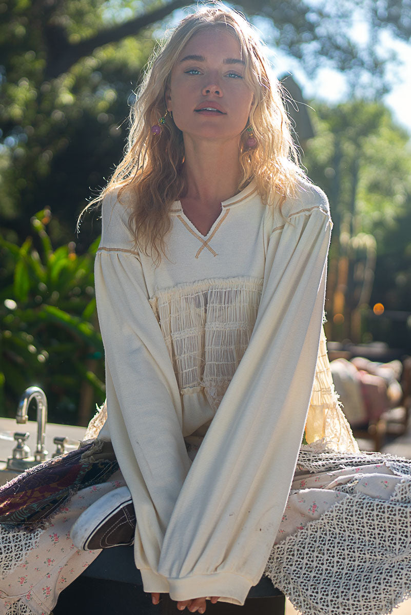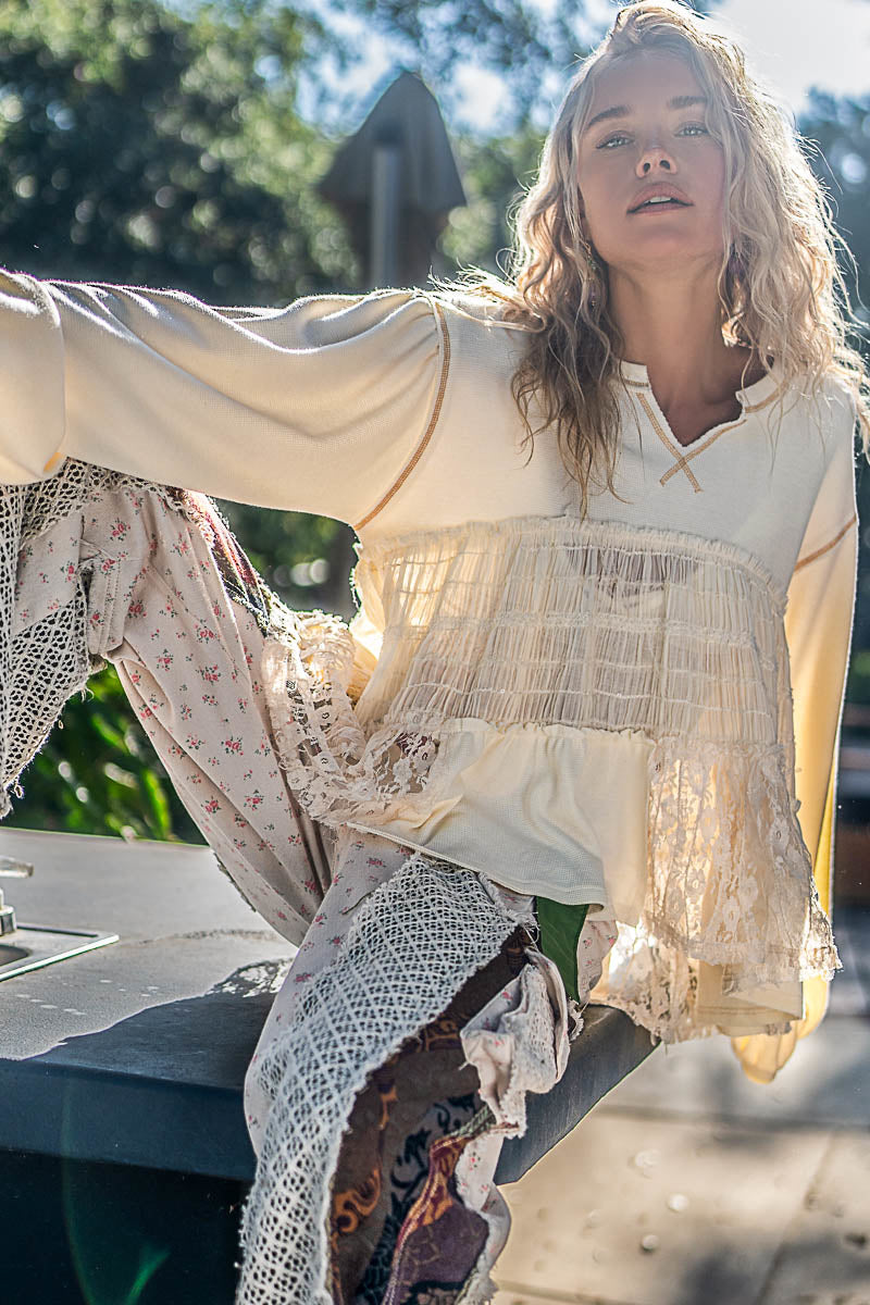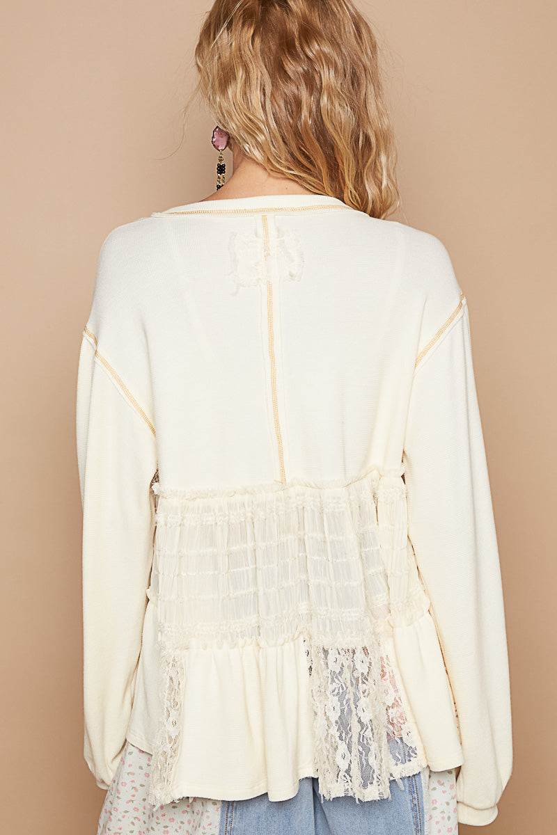 Making Moves Lace Pieced Long Sleeve Shirred Top