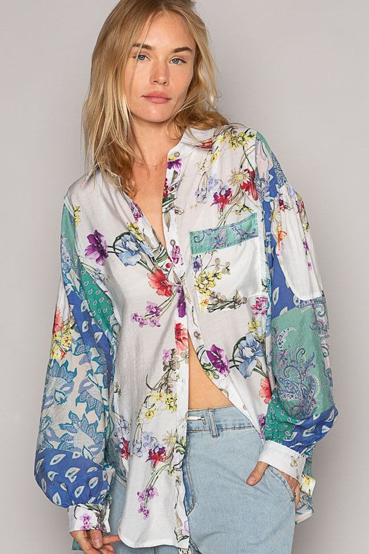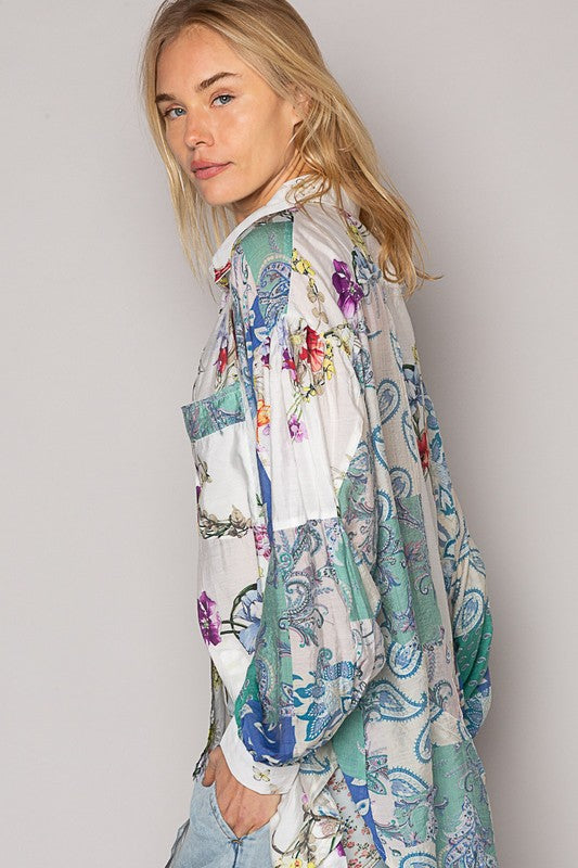Ethereal and oh-so-soft, the Meadow Sweet Colorful Floral Shirt will transport you to a whimsical dreamland. It’s lightweight with an oversized fit that gives a relaxed feel while the playful mixed floral + paisley pattern adds a touch of vintage charm. Effortlessly elegant, the button-down front allows you to adjust the neckline and style as desired. The classic collar adds a touch of sophistication, making it suitable for both casual and dressier occasions. Step into a world where reality and romance intertwine.