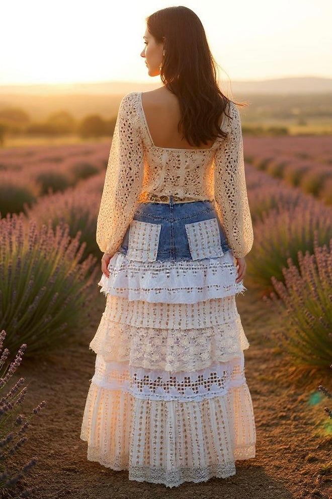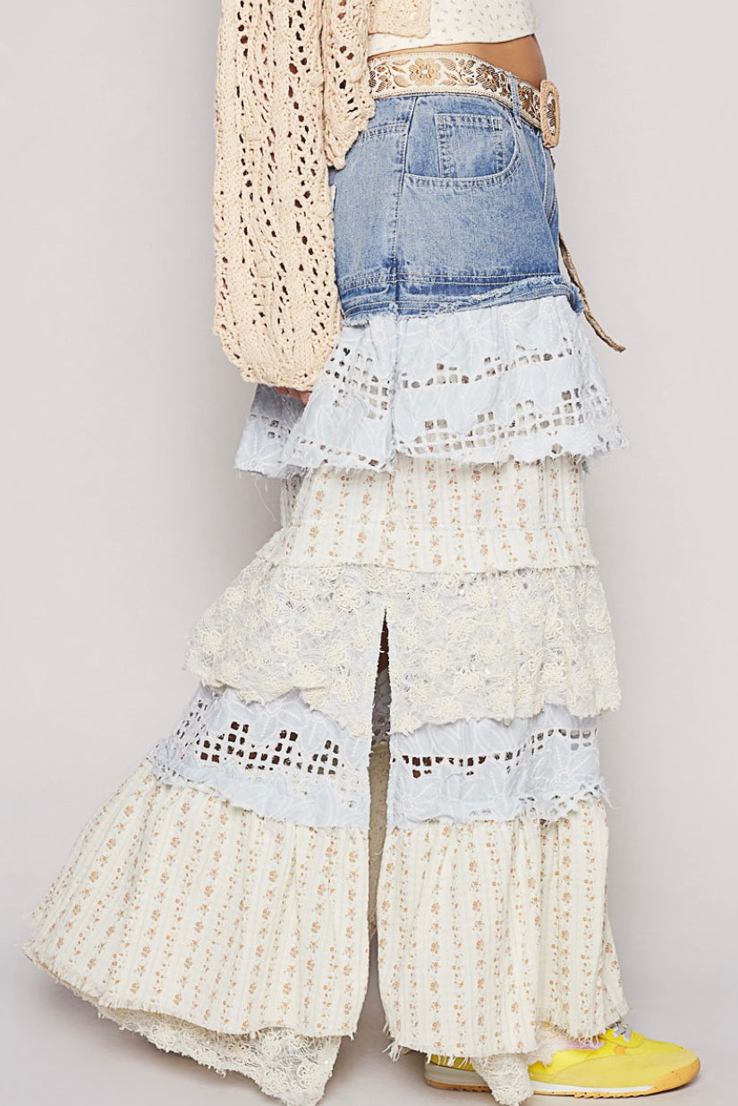 - Fabric Mix of Denim, Cotton + Lace