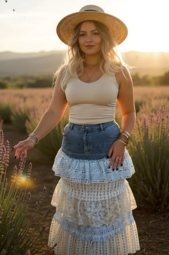 Step into a dreamscape of twilight blooms and shimmering movement. The Midsummer Magic Skirt enchants with every layer: from embroidered light blue eyelet, to cream striped cotton kissed with delicate peach flowers, to a veil of cream lace sprinkled with dainty sequins that catch the light like fireflies at dusk. Designed in a flattering A-line cut with side slits, it offers graceful movement. Matching floral cotton back pockets add a whisper of whimsy to this romantic silhouette.