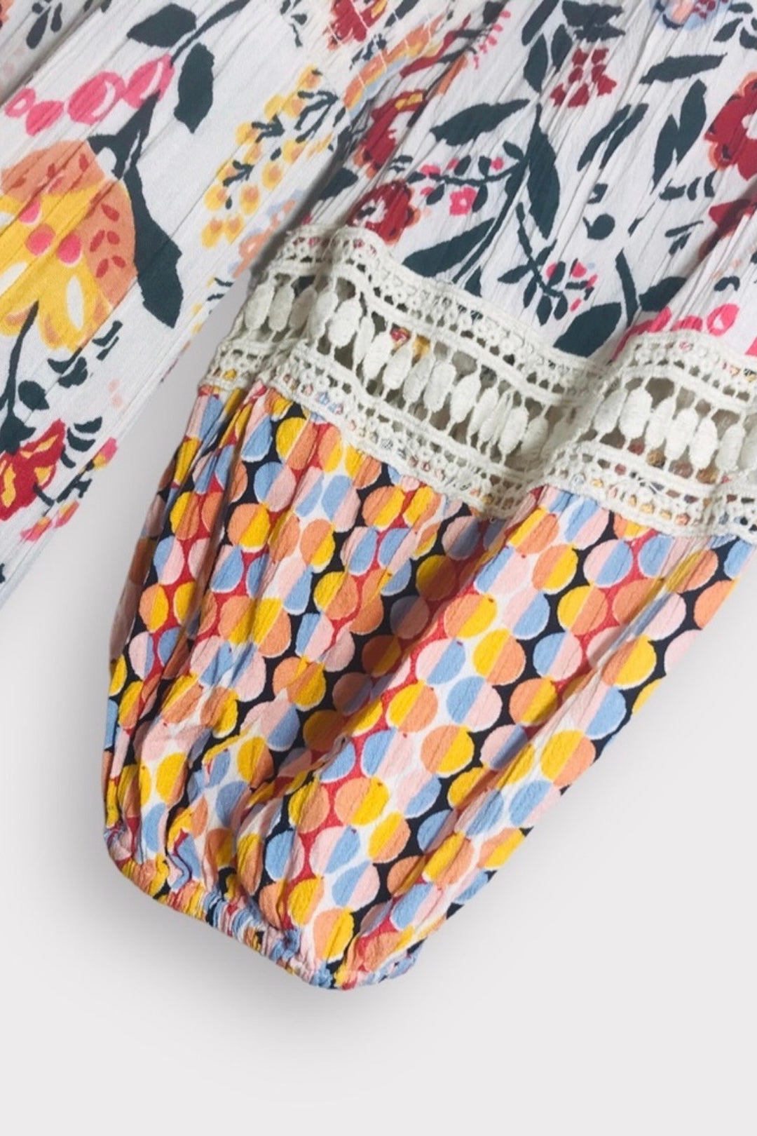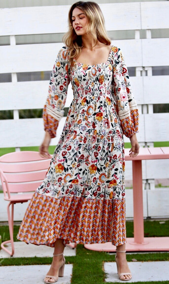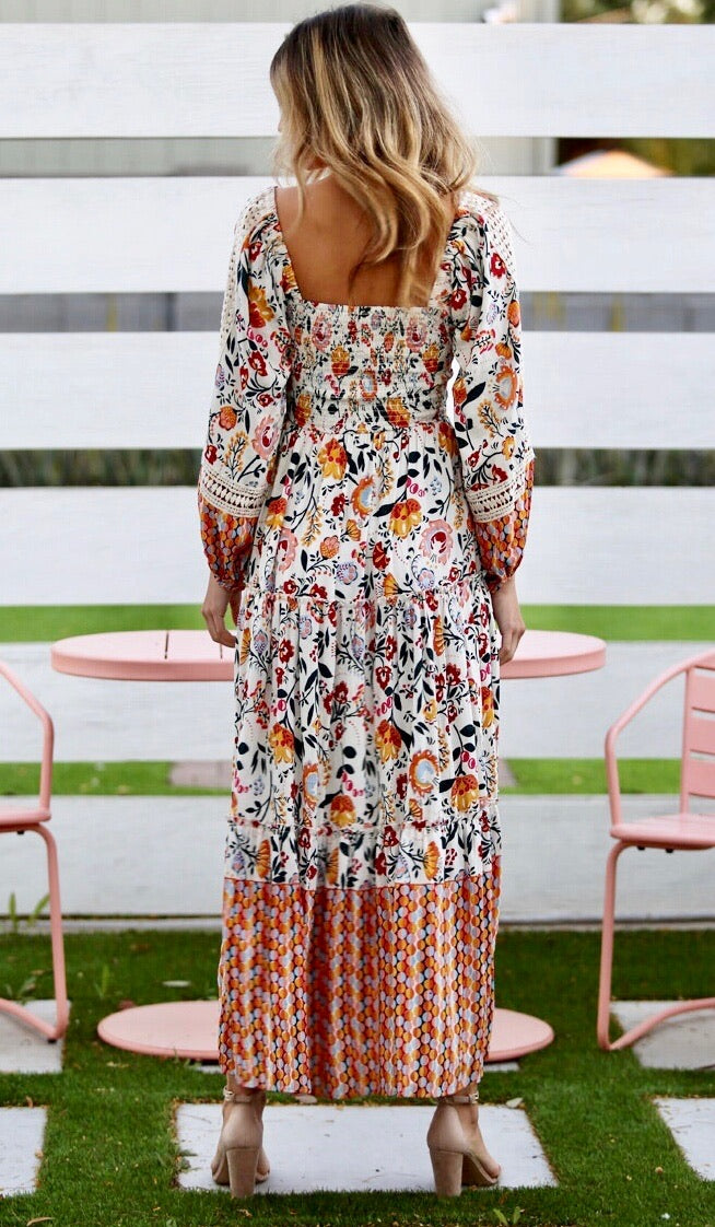 Picture Perfect Floral Long Sleeve Smocked Maxi with Crochet Lace