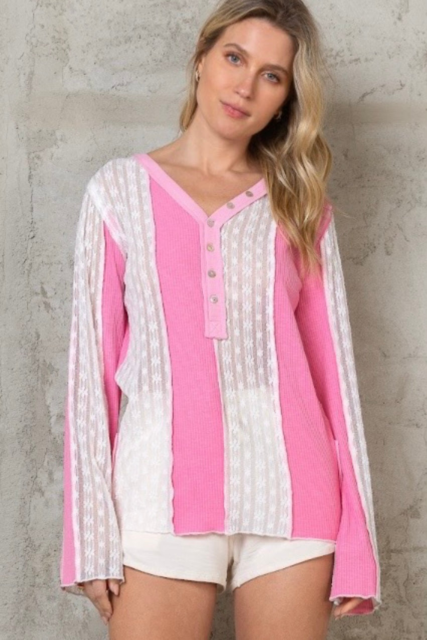 Pretty Girl Era Pink Rib + Lace Henley Top
