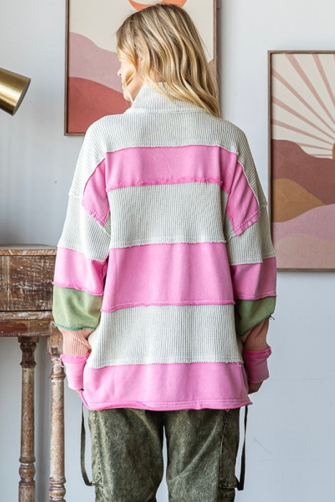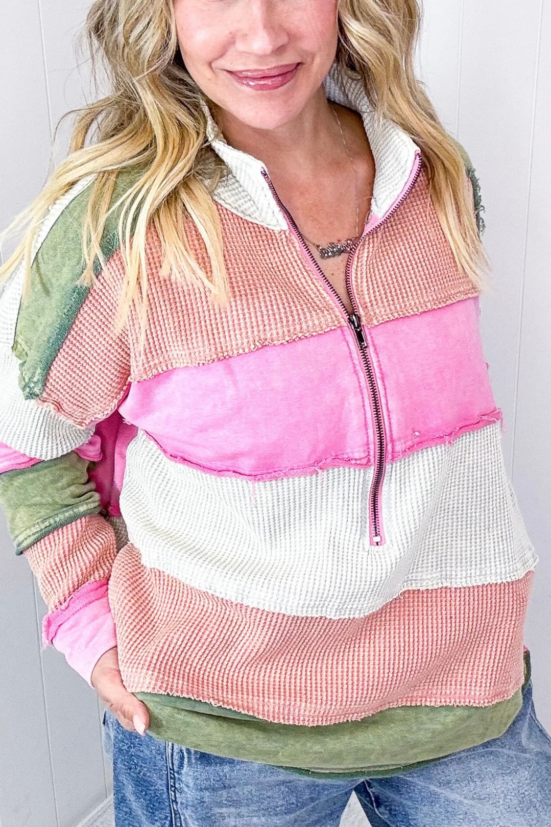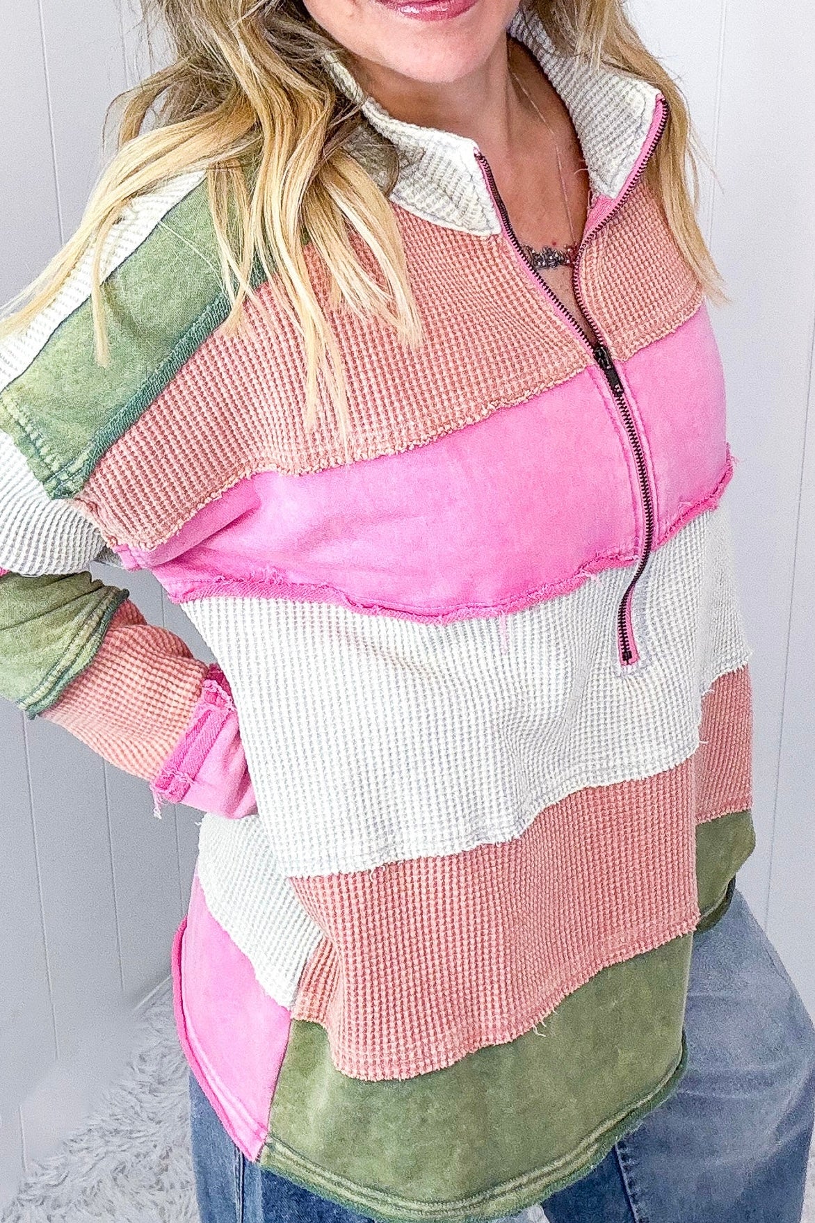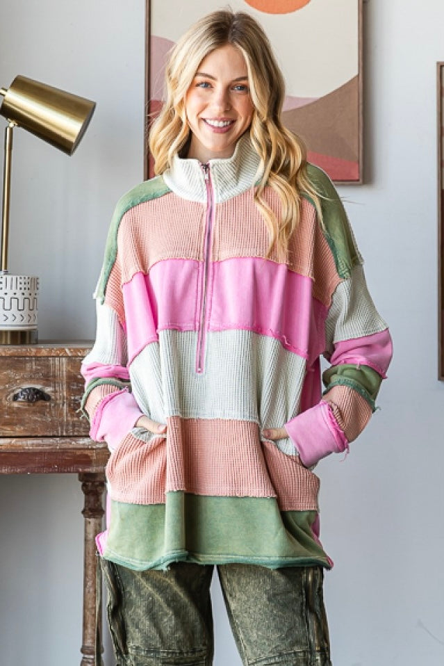 Right On Color Block Striped Half Zip Pullover with Pockets