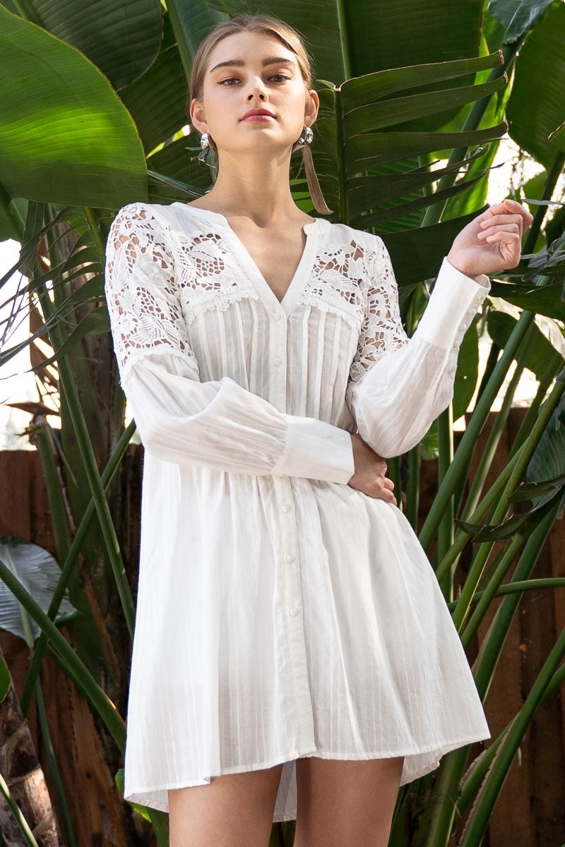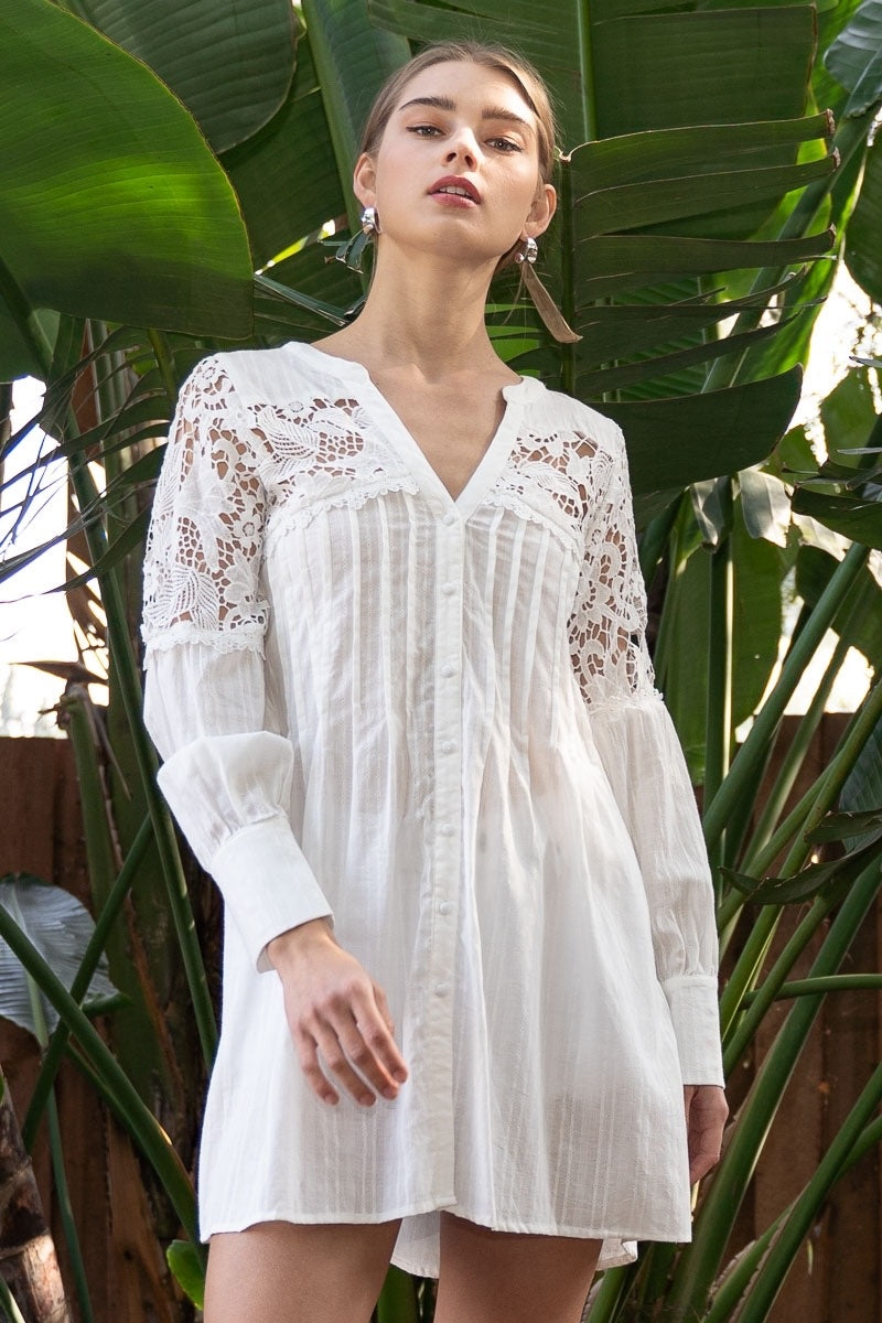 Show Stopper Lace Inset Pleated Long Sleeve Button Down Shirt