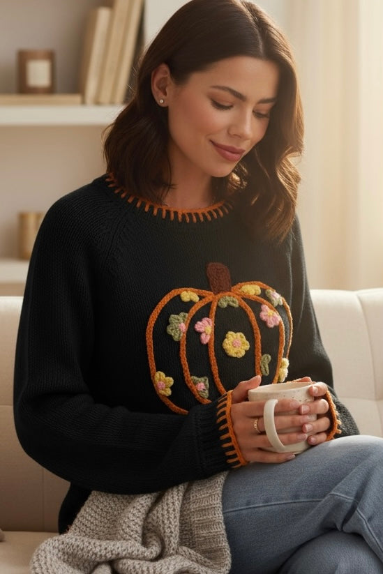 Harvest Bloom Pumpkin Embroidered Crochet Flower Sweater | Black