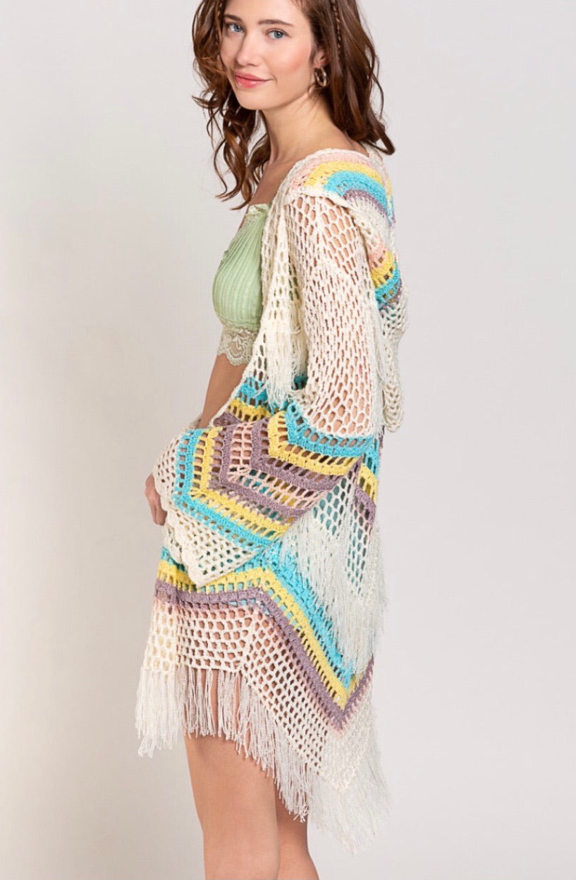 Sunset Getaway Open Knit Hooded Cardigan with Fringe