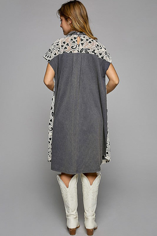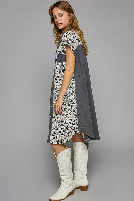 Swept Away Crochet Overlay Button Front Short Sleeve Shirt Dress