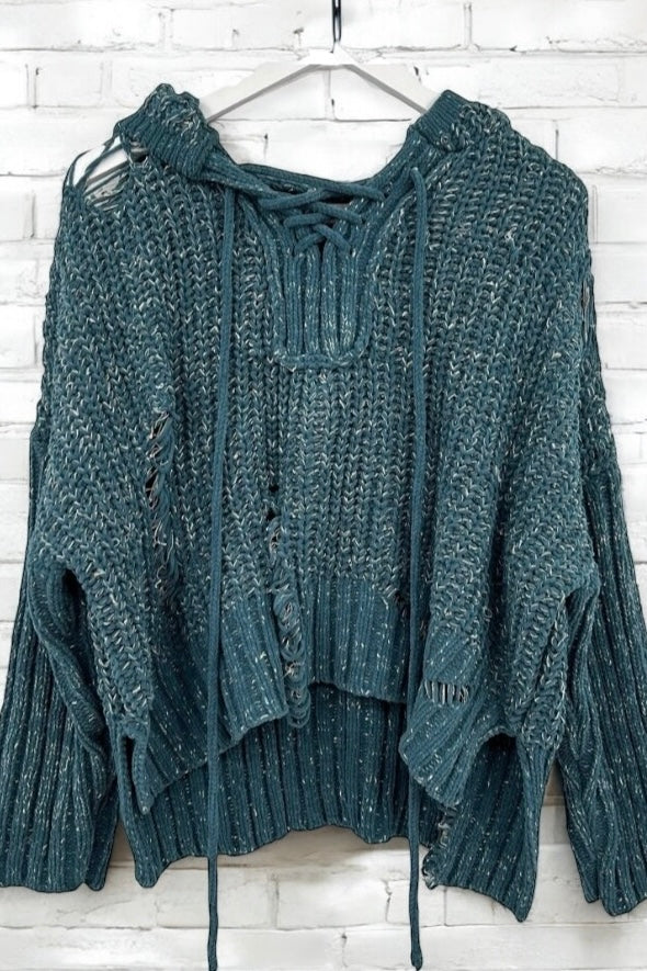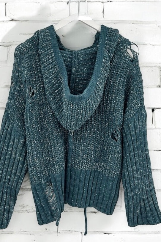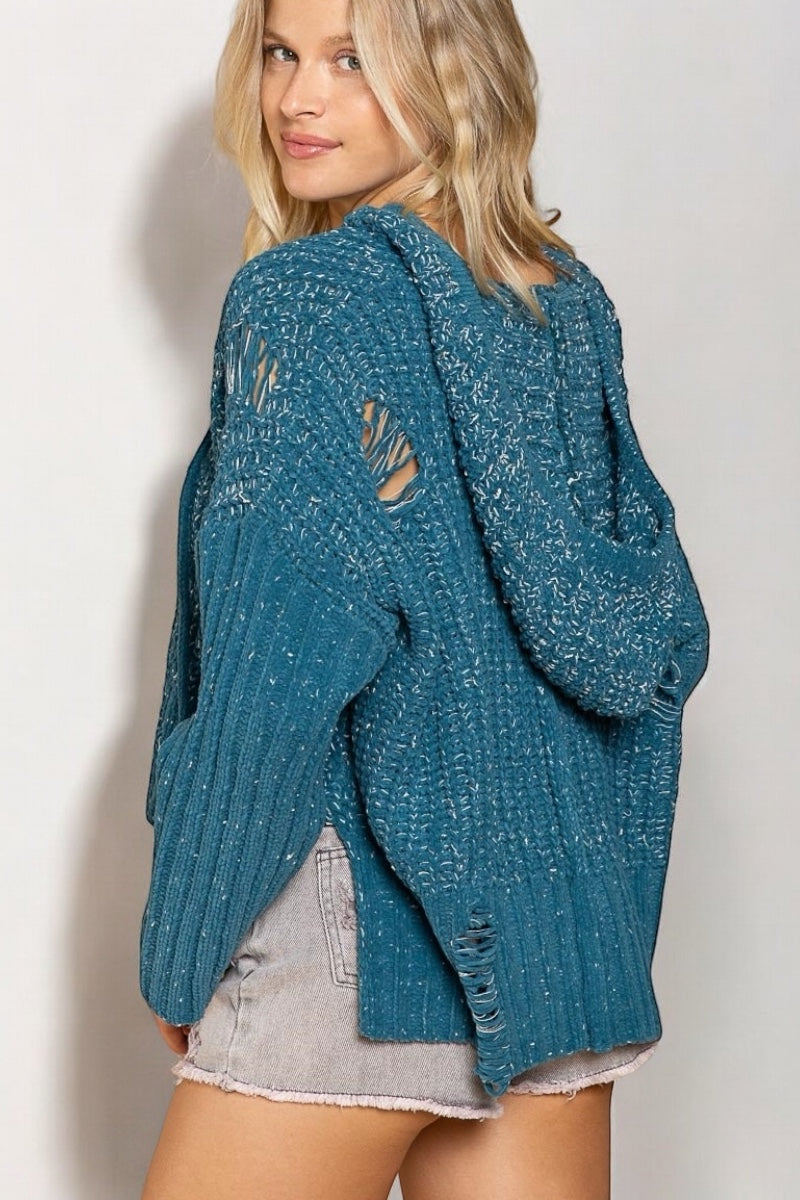 Tattered Up Color Blend Rib Knit Hoodie Sweater