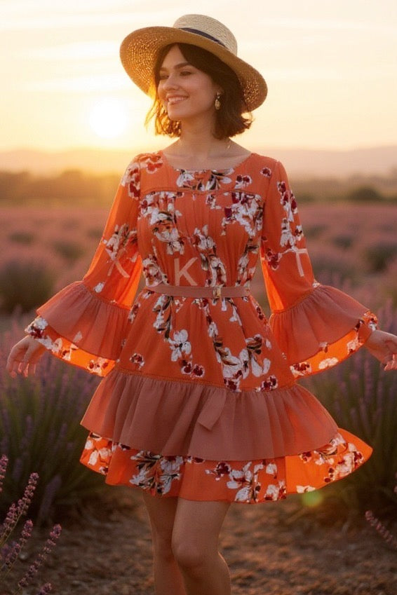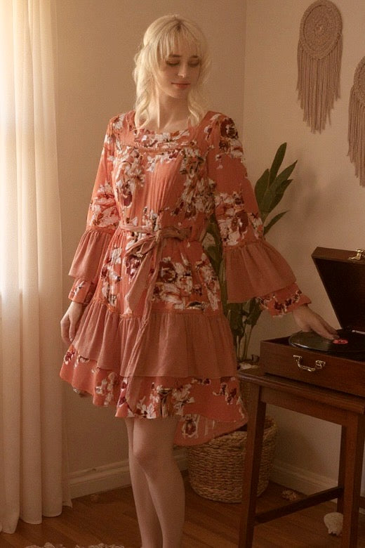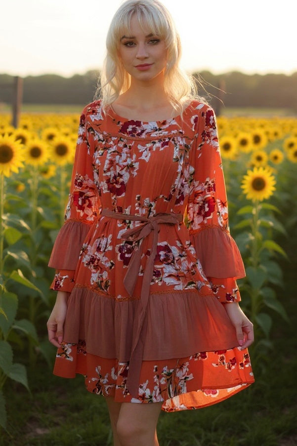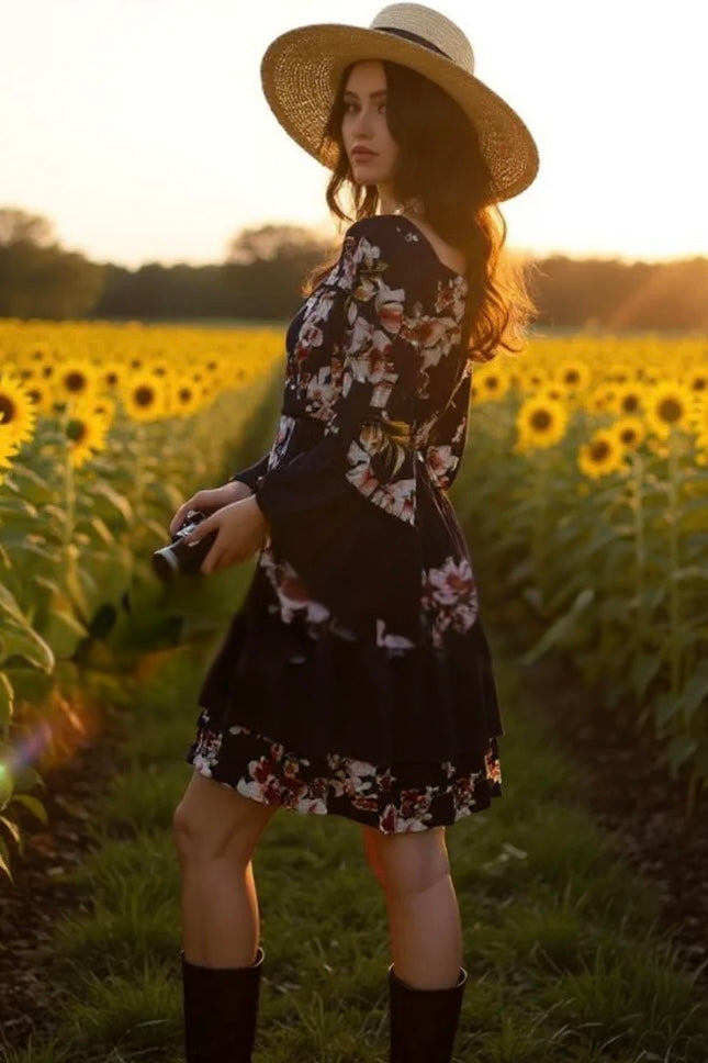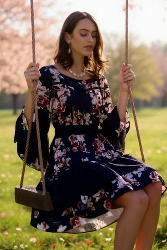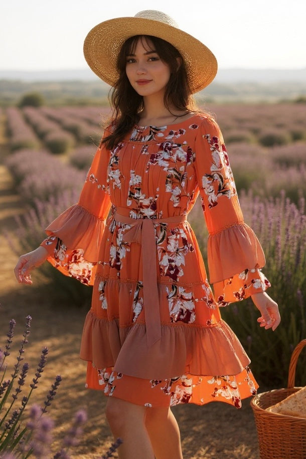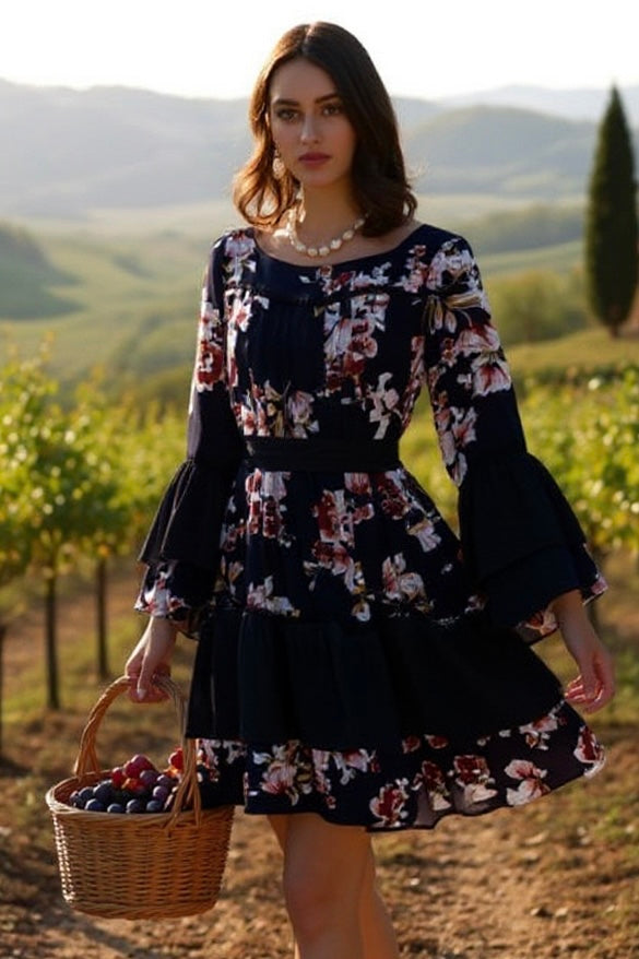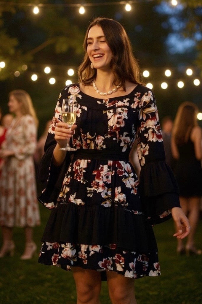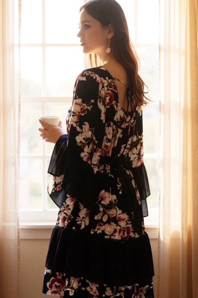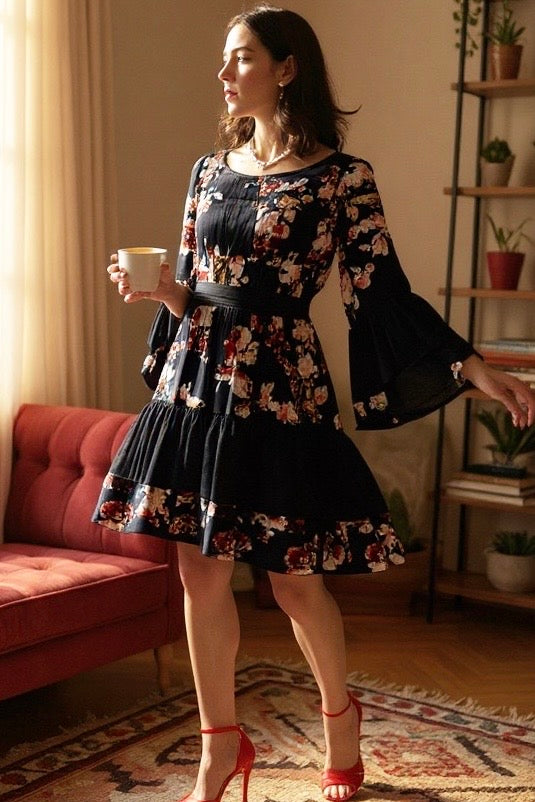 The floral mini dress pairs bold blooms with layered ruffles and sheer flirtation for a silhouette that’s equal parts enchantment and ease. The relaxed fit floats just right, while the boat neckline and scoop back with self-tie detail add soft structure. Long double-layer bell sleeves bring the drama, and the tiered ruffle mini dress moves like magic. Finished with solid contrast trim and a sash tie waist that lets you cinch or soften the shape. Clean hems, no chaos—just pure spellcasting.