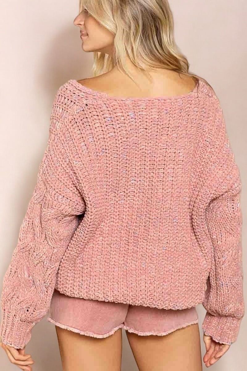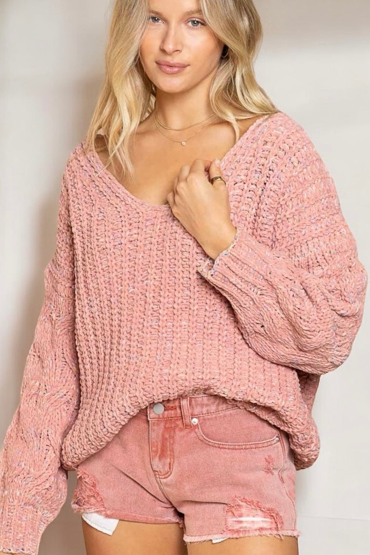 Wine Country Color Blend V Neck Sweater with Cable Knit Sleeves